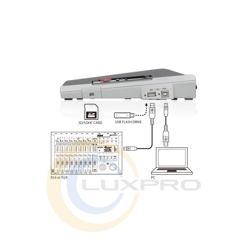 USB-порт дозволяє отримувати і відправляти цифрові дані, що перетворює рекордер ZOOM R24 в аудіоінтерфейс з 8 входами і двома виходами для роботи в DAW (наприклад, Cubase LE, яка йде в комплекті). Якщо частота дискретизації проекту становить 44,1 кГц, вхідний сигнал може оброблятися вбудованими цифровими ефектами. Ви навіть можете синхронізувати два R24 (або R24 і R16), щоб одночасно відтворювати до 48 (або 40) доріжок і записувати до 16 доріжок.