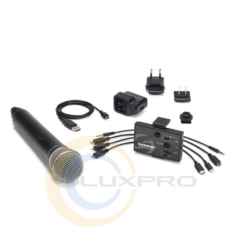 SAMSON GO MIC MOBILE w / Q8 - 2.4ГГц цифрова радіосистема, приймач може працювати з двома передавачами одночасно, можливість кріплення приймача до смартфону / планшету, на камеру або на штатив, 7-13 годин роботи від вбудованого літієвого акумулятора, робоча дистанція до 30 м , частотний діапазон приймача (аудіо): 10Гц - 22кГц, перемикається 3,5мм лінійний вихід / вихід для навушників, USB аудіовихід, HXD2 ручної передавач з динамічним мікрофонним елементом Q8, комплектація: приймач Go Mic Mobile, передавач HXD2 Q8, кабель Micro USB - Lightning, кабель Micro USB - Micro USB, кабель Micro USB - U SB-C, кабель Mini-B USB - USB-A, кабель 3.5мм - 3,5мм (TRRS миниджек), перехідник для кріплення на штатив, зарядний пристрій.