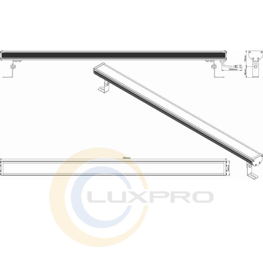 Світильники були спеціально розроблені, щоб підкреслити геометрію в інтер'єрі, перетворюючи звичайні поверхні в завіси світла. При ширині 64mm, світильники зручно монтувати уздовж стін, при низькій стелі, на колонах і стовпах, в нішах, на карнизах і т.д. Світильники працюють абсолютно безшумно завдяки відсутності вентиляторів (конвекційна система охолодження), що робить їх ідеальним рішенням для постановок на відкритому повітрі, а також зовнішніх і внутрішніх арт-інсталяцій. До характерній рисі лінійки варто віднести застосування сучасних високоефективних напівпровідникових джерел світла потужністю 3W відомих брендів.Світильники забезпечують значну економію електроенергії та високий ресурс (не менше 50 000 ч.). Не вимагають постійного сервісного обслуговування. Світильники застосовуються спільно зі спеціалізованими блоками живлення c струмового стабілізацією 700ma. Світильники виготовляються в Україні. (Made of Ukraine). Нами проводиться гарантійне та післягарантійне обслуговування виробленого обладнання. Можливо виготовлення світильників з нестандартними характеристиками (довжина, кольори, кріплення).Характеристики: