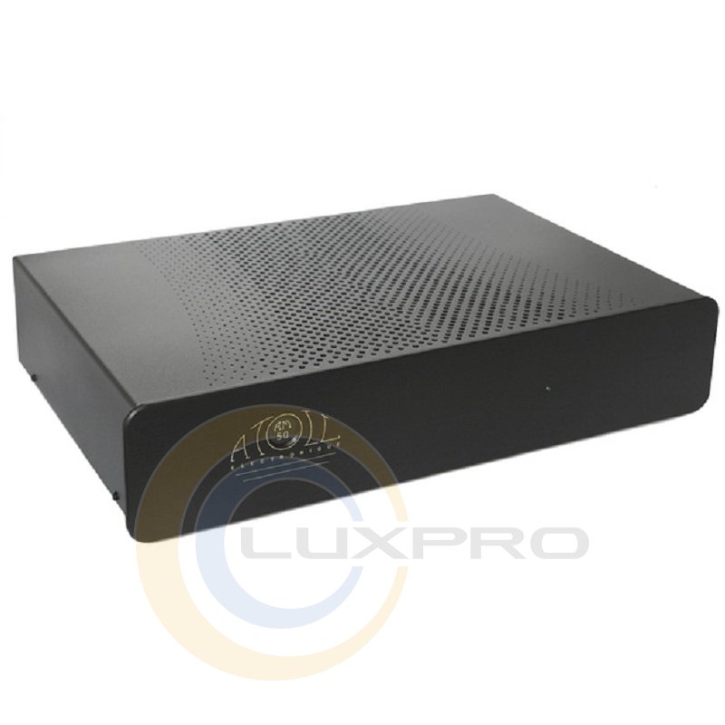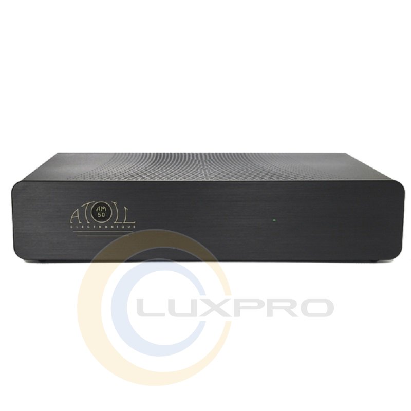 Стереофонічний підсилювач потужності Atoll AM50SE має простий функціональний дизайн, і єдиною прикрасою його товстої металевої передньої панелі є логотип компанії-виробника.Даний апарат є молодшою моделлю в модельному ряду «оконечниками» фірми, і цифра в його назві показує потужність на канал, що розвивається при підключенні до Atoll AM50SE восьміомной акустики. При приєднанні 4-омной навантаження цей показник виросте до 70 Вт на канал.Підсилювач має конфігурацію подвійного моно, його канали зібрані на роздільних друкованих платах, і мають незалежне живлення від тороїдального мережевого трансформатора. На задній панелі підсилювача має пара лінійних RCA-входів, а також якісні гвинтові клеми для двох АС. Підсилювач виконаний в строгому функціональному мінімалізмі, коли максимальна кількість витрачених на його створення коштів пішло саме на якість звуку.Апарат зібраний на дискретних елементах високої якості, має укорочені звукові ланцюга, і змонтований на друкованих платах з металізацією збільшеної товщини. У випрямлячі блоку живлення використовуються швидкодіючі діоди, а для фільтрації напруги використані конденсатори ємністю 15000 мкФ. В кінцевих каскадах пристрої використовуються швидкодіючі транзистори, що забезпечують швидкість наростання вихідного сигналу до 1,5 мкс. Завдяки високій вхідної чутливості цей підсилювач можна використовувати в тому числі і з пасивними регуляторами гучності.Незважаючи на гадану простоту, Atoll AM50SE досить гнучкий у використанні. Крім класичного варіанту використання з підсилювачем (наприклад, Atoll PR100 або PR200), цей апарат можна включати спільно з основним інтегральним підсилювачем системи для реалізації схеми підключення акустики bi-amping. При бажанні підсилювач Atoll AM50SE можна включити і в мостовому режимі, перетворивши його в моноблок з неабиякою вихідною потужністю.Підсилювач виконаний в суцільнометалевому корпусі, і його шасі надійно ізолює електронні схеми від будь-яких небажаних зовнішніх впливів.Характеристики: