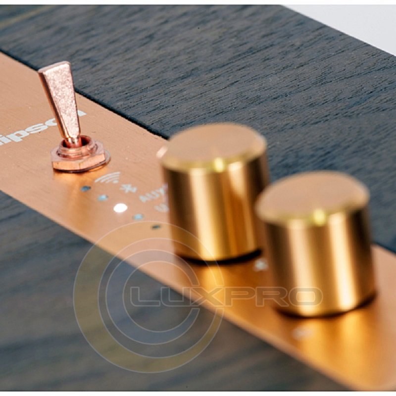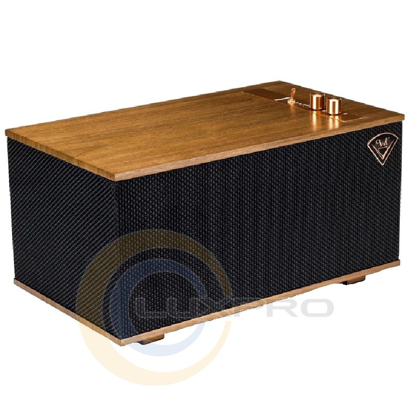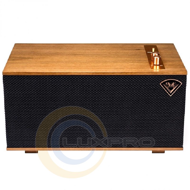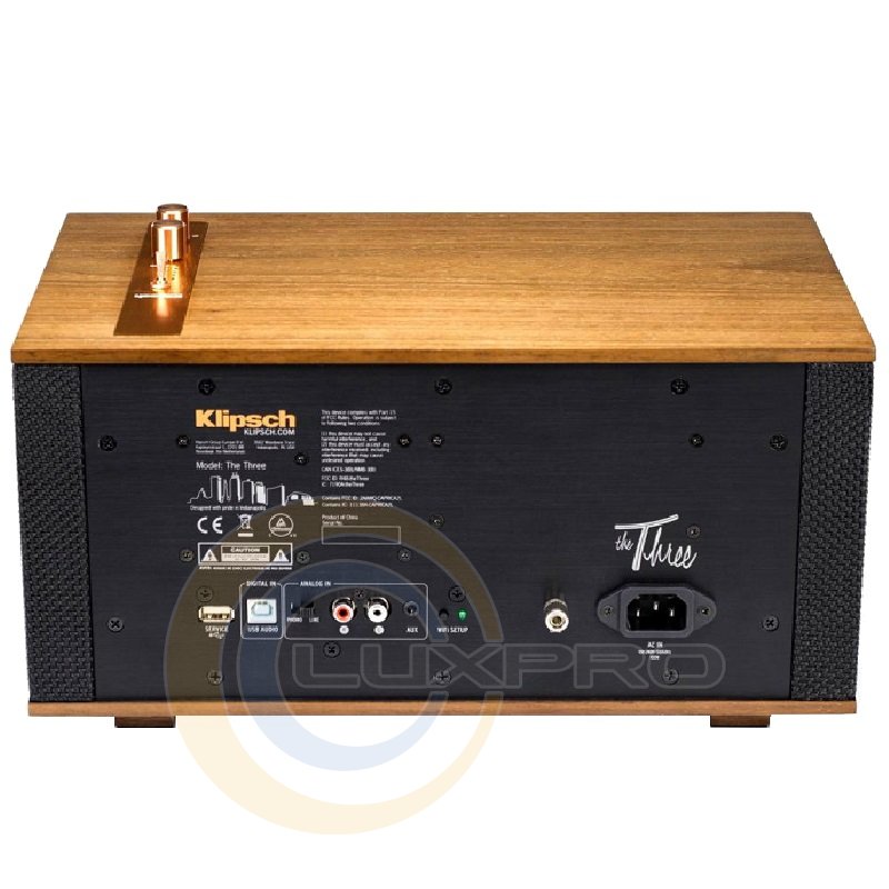 Бездротова акустична система Klipsch The Three Walnut в ретро-стилі, c обробкою натуральним шпоном, має рифлені мідні ручки управління. Модель відповідає всім сучасним вимогам з технологіями Play-Fi і Bluetooth з aptX і підтримкою сервісу Spotify (інтернет-радіомовлення, потокові сервіси, цифрові музичні записи). Основна частина корпусу оброблена деревом (візерунок у кожної колонки унікальний).