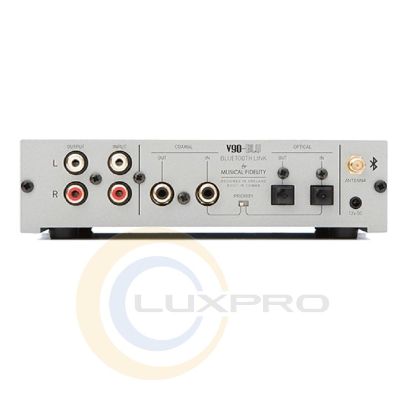 Ресивер Musical Fidelity V90-BLU оснащений вбудованим передавачем Bluetooth, що дозволяє йому працювати з різними цифровими джерелами сигналу - домашніми комп'ютерами, ноутбуками, смартфонами і планшетами. Крім того, в ньому передбачені і традиційні входи для кабельних комунікацій.