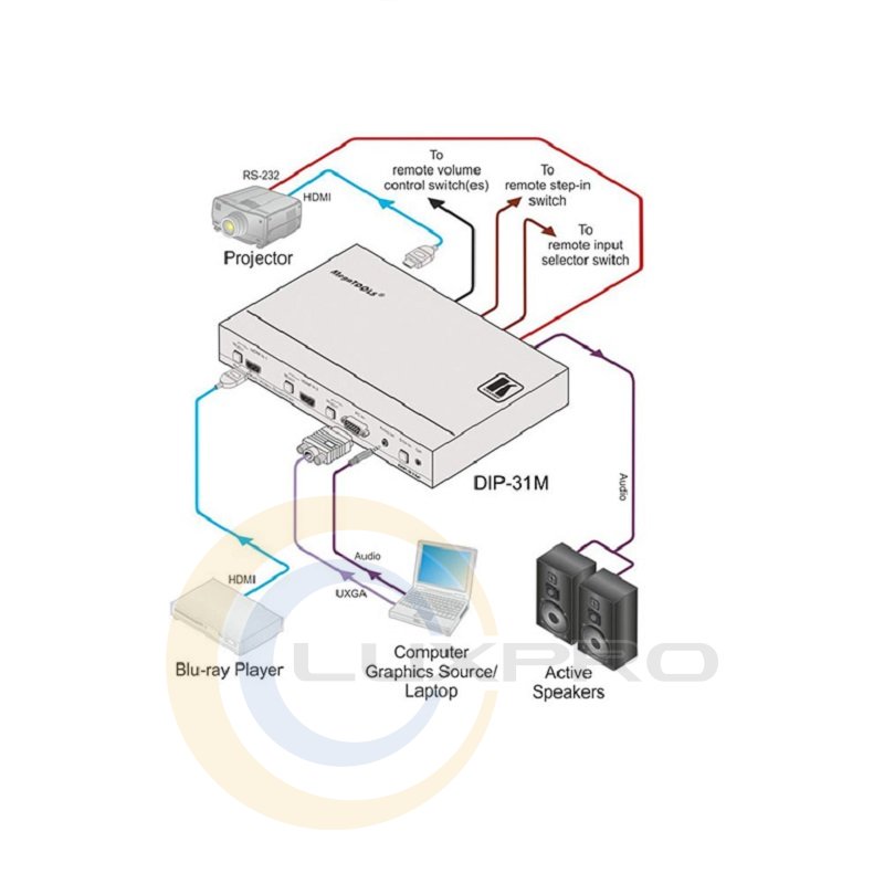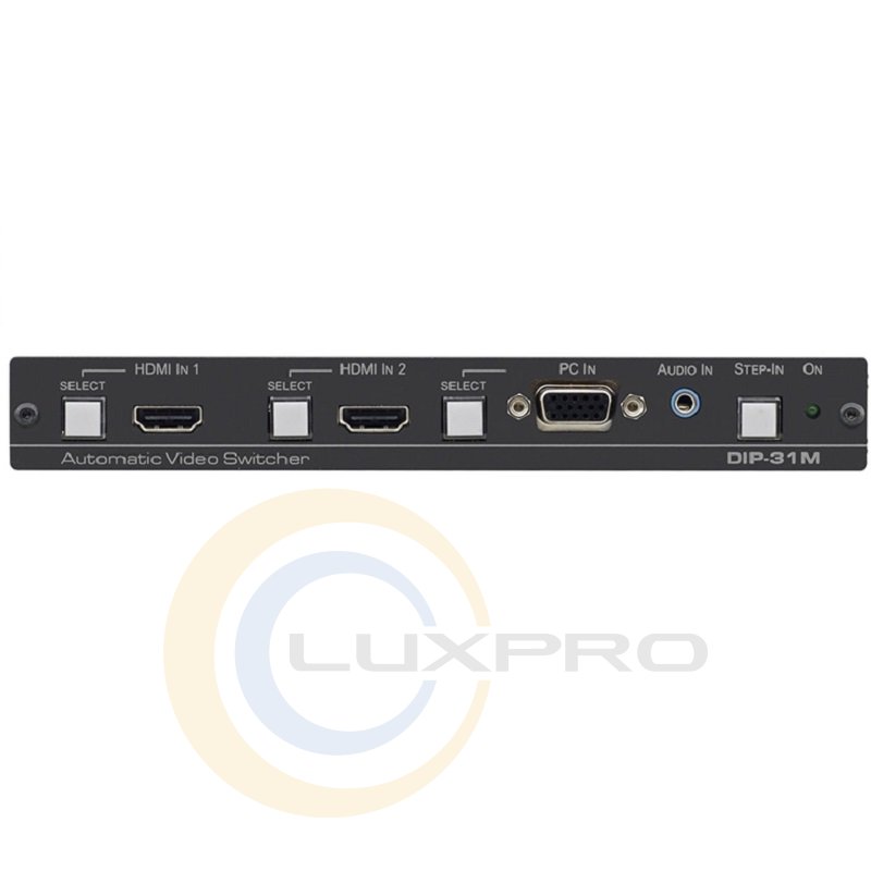 DIP-31M - автоматичний комутатор двох входів HDMI, VGA і стереоаудіо з виходом HDMI, кнопка управління зовнішнім комутатором Step-In. Дозвіл до 4K / 60 при колірному просторі 4: 2: 0. Підтримка HDCP і розширеного EDID. Ембеддер і деембеддер стереоаудіо, настройка автоматичної комутації. Забезпечується передача команд управління з інтерфейсу RS-232. Управління пристроєм здійснюється через web-інтерфейс або за допомогою RS-232.