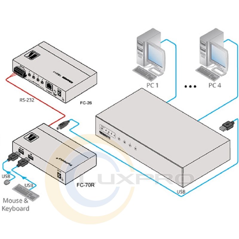 FC-70R - перетворювач сигналу RS-232 в USB для використання з KVM-комутатори компанії HighSecLabs. Прилад дозволяє організувати дистанційне керування згаданим обладнанням з контролера RS-232 (наприклад, SL-1N) або ПК, перетворює керуючі команди RS-232 для виклику їх комбінацій клавіш стандартної комп'ютерної клавіатури, що підключається по USB.