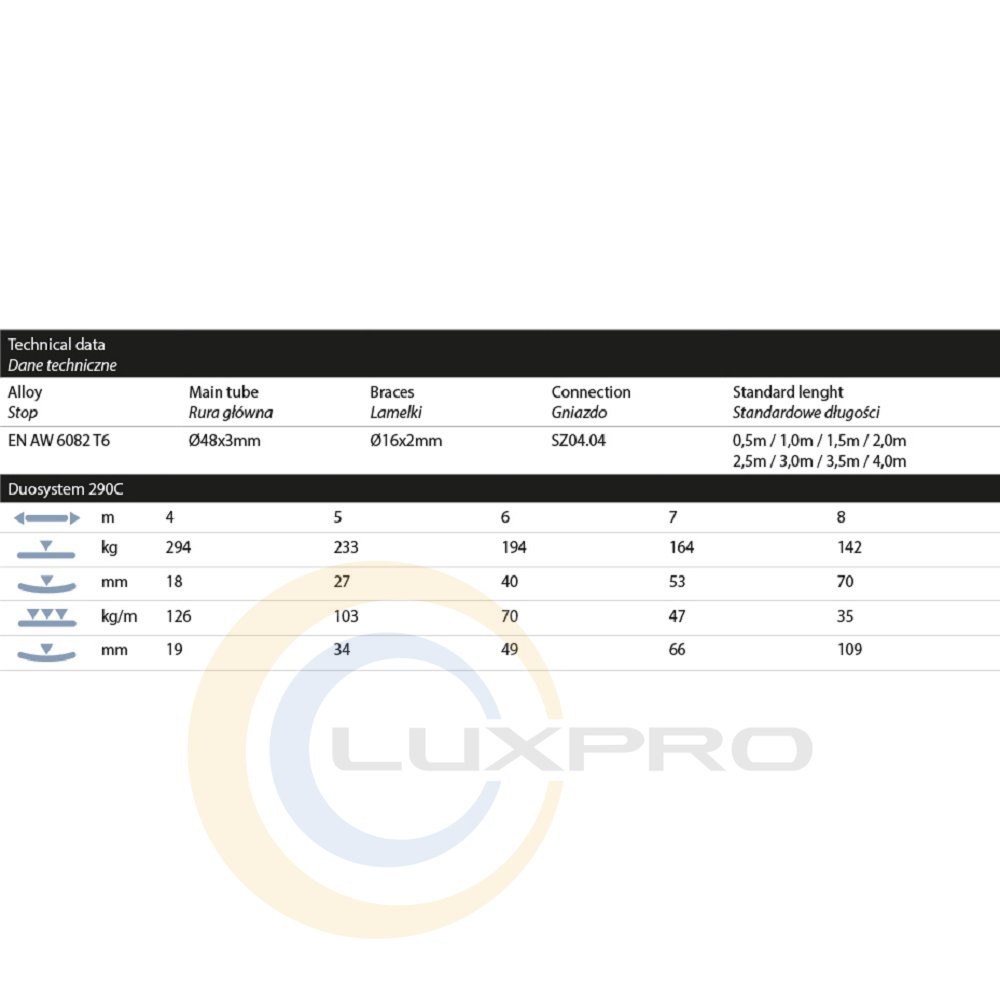 Посилена ферма з діаметром труби 48х3 мм для створення великих конструкцій і сценічних навісів.Ферма DUO 290 A виконана з труби 48 x 3 мм і перемичок 16 x 2 мм, обладнана конічним коннектором - гніздом SZ 04.04. Алюмінієва ферма завдяки своїй конструкції має привабливий, не громіздкий вигляд і велику витривалість, високу стійкість до впливу на них великих навантажень. Із застосуванням наших систем можна створювати різноманітні конструкції в залежності від поставленої мети. У тому числі алюмінієві ферми можуть бути підставою конструкції даху сцени, можуть застосовуватися для створення конструкцій виставкових павільйонів, конструкцій для кріплення проекційних і LED екранів, секцій для розташування звукового і освітлювального устаткування. Якість кожної ферми знаходиться на максимально можливому для подібного виду виробів рівні, що підтверджено сертифікатами ISO DIN 4113 і TUV, а кожен елемент пройшов кілька стадій перевірки якості.Характеристики: