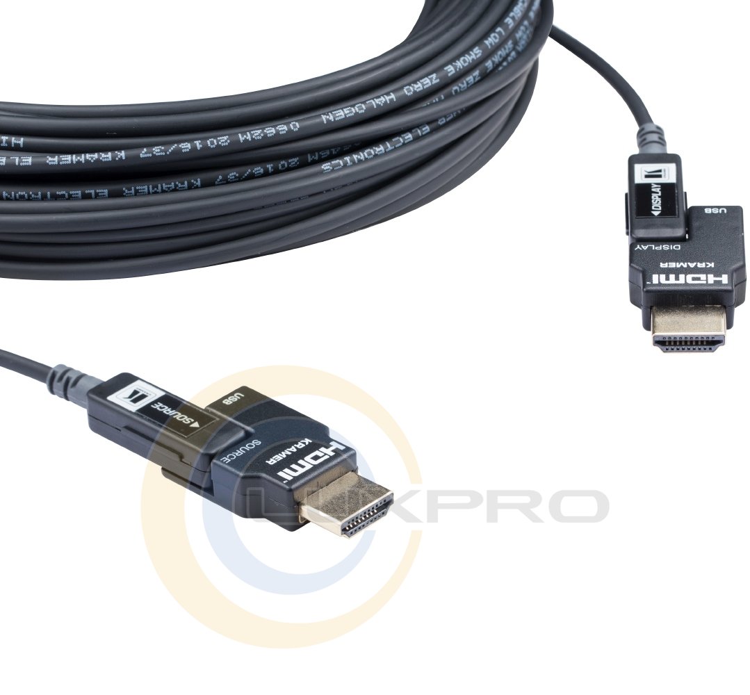 CLS-AOCH/60-131 - малодимний оптоволоконний кабель HDMI. Активний гібридний оптоволоконний кабель виробництва Kramer, оконцован micro HDMI, має знімні роз'єми HDMI типу A (вилка-вилка). Дозволяє організувати лінію передачі сигналів дозволом до 4K / 60 з підтримкою HDCP, EDID і HDR на відстані до 100 м. Оболонка LSHF (без галогенів). Зовнішній діаметр - 3,4 мм, радіус вигину - 6 мм.