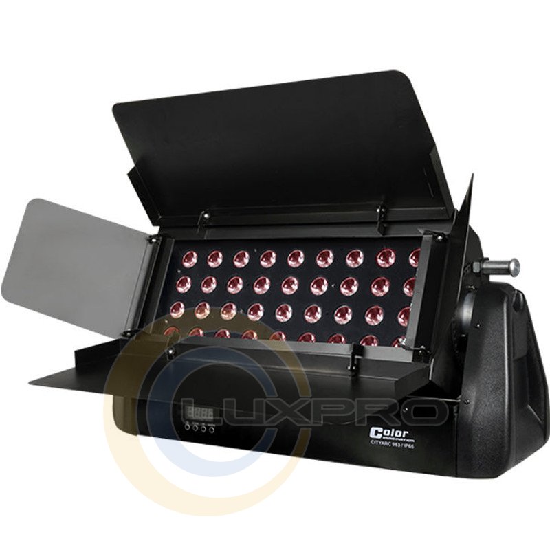 CITYARC 963 має водонепроникний корпус IP65 з кутом TILT, з регульованим вручну кутом нахилу, щоб висвітлювати великі архітектури під будь-яким кутом з будь-якими кольорами шляхом змішування. Прожектор обладнаний світлодіодами 96PCS 3W 4-IN-1, RGBW. Він задовольняє будь-які потреби з надзвичайно неймовірною світловіддачею.