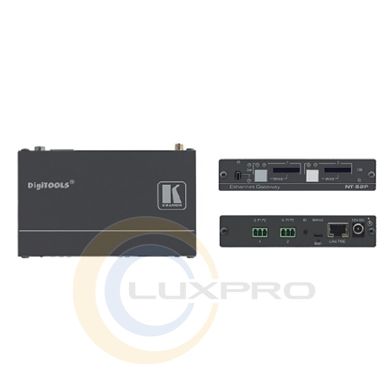 NT-52P - компактний універсальний перетворювач двонапрямлених інтерфейсів RS-232, RS-485, сигналів ІК, портів GPIO, реле і Ethernet з підтримкою POE. Прилад має два універсальних порту, вільно конфігуруються в один з режимів управління: RS-232 (пряме і нуль-модем повільний), RS-485, ІК, GPIO або реле типу «сухий» контакт; доступ до портів здійснюється віддалено через локальну мережу Ethernet. NT-52P підтримує одночасне підключення до 40 IP-клієнтів для управління мультимедійним обладнанням, датчиками, освітленням, шторами, моторизованими екранами і т.п.