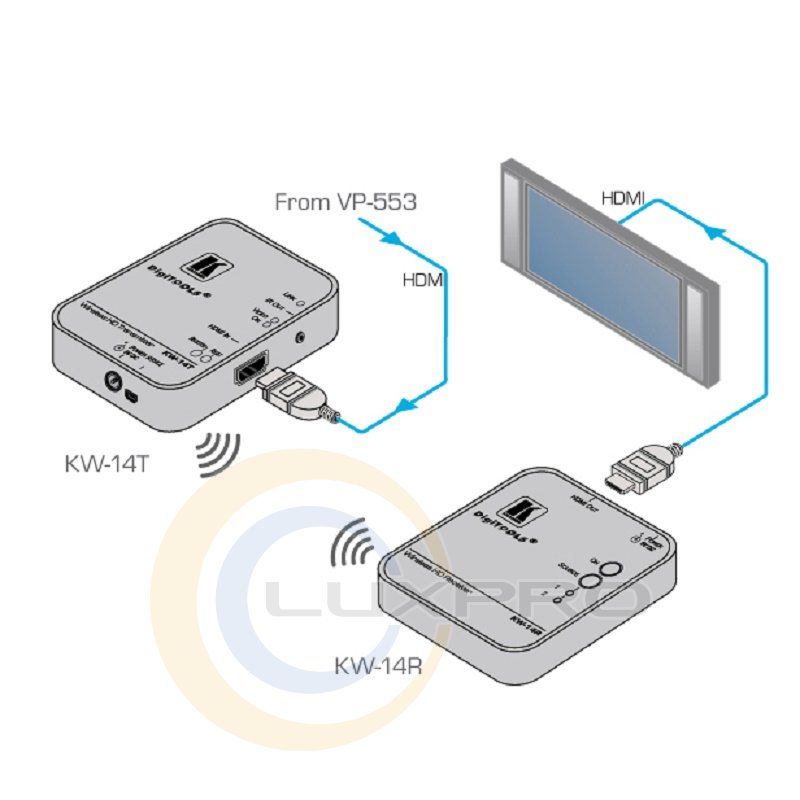 KW-14 - передавач і приймач для бездротової передачі сигналу HDMI з HDCP 2.0 і EDID з дозволом до 1080р / 60 Гц. Один передавач може транслювати сигнал одночасно на чотири приймача. Кожен приймач має можливість з'єднання з трьома передавачами. Приймач і передавач в комплекті мають встановлене з'єднання. Дальність передачі - до 30 м. Робоча частота - від 5,19 до 5,795 ГГц, оптимальна частота встановлюється автоматично. При відсутності сигналу прилади автоматично переходять в режим очікування.Характеристики: