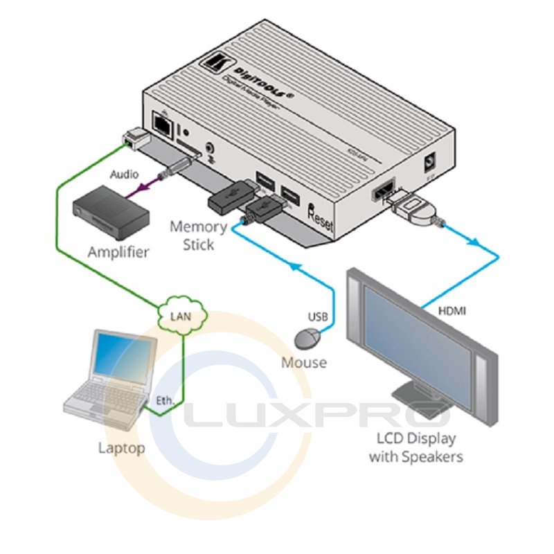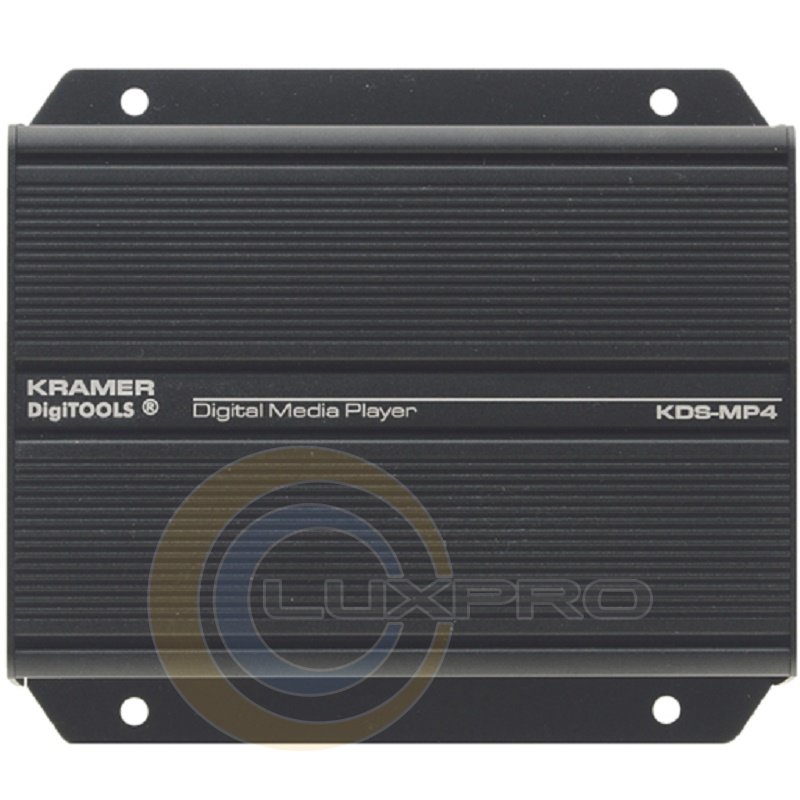 KDS-MP4 - мережевий цифровий програвач інформаційно-рекламного контента з підтримкою 4K (2720p). Виходи HDMI, аналогового стерео (mJack 3.5 мм), S / PDIF. Відтворює вміст, завантажене у внутрішню пам'ять по Ethernet, або використовує USB-флеш-накопичувач. Вбудована пам'ять 8 ГБ, слот microSD для розширення. Підтримка W3C HTML5 (HTML, CSS, JavaScript), W3C SMIL 3.0, кодеків MPEG-1, MPEG-2, MPEG L2, MP3, H.264 / MPEG-4 і VC-1. NTP-клієнт. Вбудована система управління контентом, підготовка контенту за допомогою ПО Kramer Media Manager (для ПК). VESA-кріплення, отвір під Кенсінгтонський замок.Характеристики: