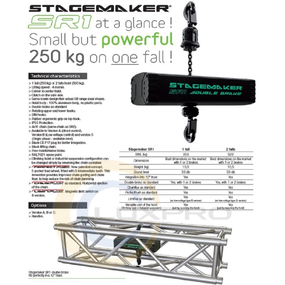 - Електрична ланцюгова лебідка SR1 252 m1 A (G80)- У комплектацію входить ланцюг G80 довжиною 20 метрів - Електрична ланцюгова лебідка прямого управління, стаціонарне / самопідйомної положення. Вантажопідйомність: 250кг. Запатентований шків Perfect Push. Магнітні кінцеві обмежувачі Limitflux. CHAINFlux MKII®. Сумка для ланцюга. Чорна ланцюг з гальванічним покриттям. Колір: чорний RAL (7021). Алюмінієвий корпус. Гумові буфери на торцях. Доступний ряд опцій: одиночний гальмо, невращающейся гак, інкрементальнийе Енкодери, комплектація для відповідності стандарту VBG-C1. система контролю навантаження, чохол від дощу. 460V 3 фазна. 230V 1 фазна версії. - STAGEMAKER SR1 - нова модель в лінійці SR, призначена для підйому вантажів вагою до 250 кг і оснащена одним ланцюгом. Такі переваги, як легка вага і компактність дозволяють моделі STAGEMAKER SR1 виконати установку підйомника на алюмінієві балки розміром всього 12 ". У стандартну комплектацію моделі входить система подвійного гальма, направляючий блок CHAINFlux для плавного потоку ланцюга, запатентований ланцюгове колесо Perfect Push і захисні гумові елементи на вантажівок підвісках. - STAGEMAKER SR1 ідеально підходить для одиночного розташування і незалежного підйому вантажу до 250 кг. Завдяки ергономічному дизайну і чорному кольору, підйомник залишається непомітним на тлі освітлювальних систем, а низький рівень шуму (50 дБ) робить роботу підйомника нечутною під час вистав. Модель STAGEMAKER SR1 доступна в наступному діапазоні підйомних швидкостей: 4 м / хв, 3 фази і 3 м / хв, 1 фаза. - Модель пропонується у версії А (пряме управління), B (низьковольтне управління) і S (одна фаза). З огляду на номінальну вантажопідйомність одноцеповой моделі, підйомник відповідає нормам D8 + при навантаженнях до 125 кг. - STAGEMAKER SR 1 оснащений самими передовими функціями для відповідності чинним вимогам безпеки. Подвійний гальмо входить в стандартну комплектацію і дозволяє використовувати підйомник згідно з нормою D8 +. Більш того, модель укомплектована особливим ланцюговим колесом Perfect Push, яке розроблено спеціально для лінійки STAGEMAKER SR. Особливість полягає в проміжних зубцях, які забезпечують більш плавний потік ланцюга в комплекті з напрямних блоком CHAINFlux MKII. Новий обмежувач крутного моменту дозволив розташувати систему зчеплення в редукторі і тим самим посилити гальмо, забезпечуючи утримання вантажу незалежно від умов експлуатації обладнання. Всі підйомники версії В (низьковольтне управління) оснащені електричними кінцевими вимикачами Limitflux, які обмежують хід ланцюга в установленому верхньому і нижньому положенні. - Модель SR1 розширила ряд одноцепових підйомників лінійки STAGEMAKER SR: - SR1 для вантажів до 250 кг, - SR2 для вантажів до 320 кг, - SR5 для вантажів до 500 кг, - SR10 для вантажів до 1000 кг, - SR25 для вантажів до 2500 кг. - Особливості: - 3-фазні двигуни (400 В / 415 В / 3Ph / 50 Гц) з прямим управлінням напругою (плата ACF).