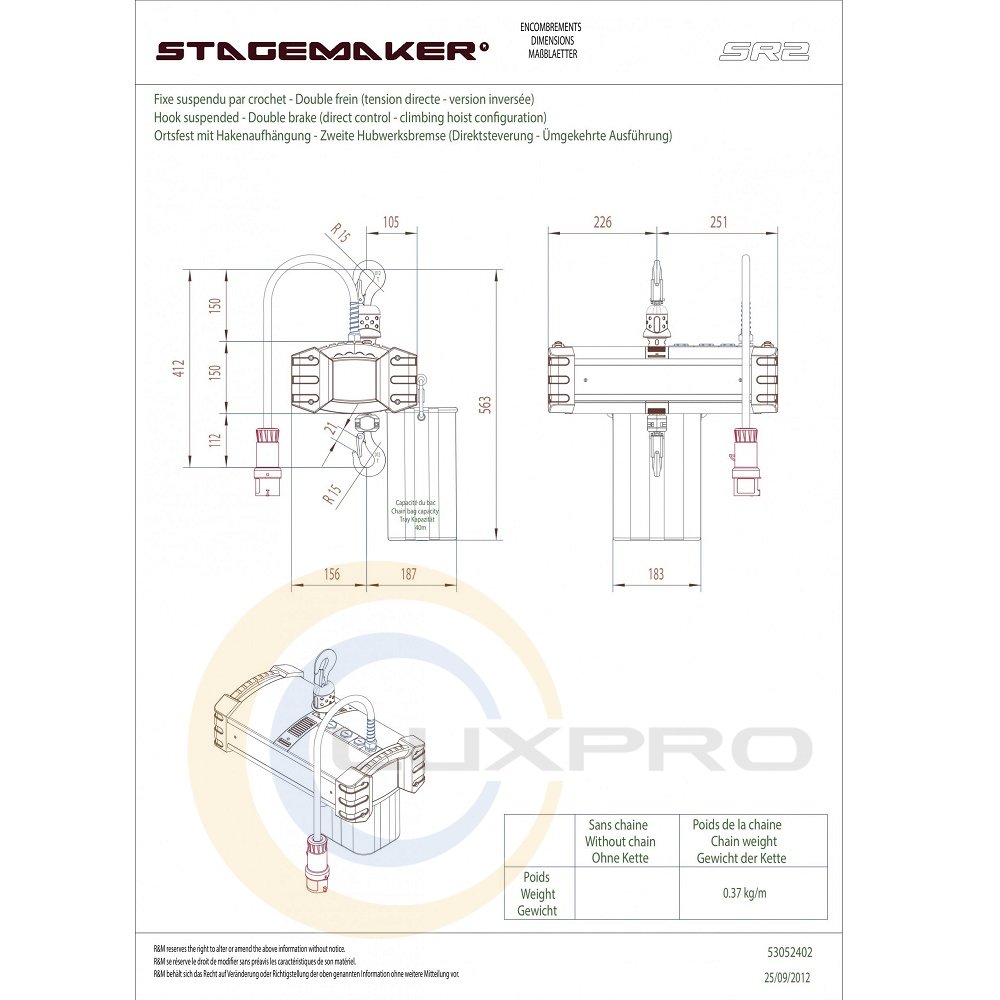 Електрична ланцюгова лебідка прямого управління, стаціонарне / самопідйомної положення. Вантажопідйомність: 320кг. Запатентований шків Perfect Push. Магнітні кінцеві обмежувачі Limitflux. CHAINFlux MKII®. Сумка для ланцюга. Чорна ланцюг з гальванічним покриттям. Колір: чорний RAL (7021). Алюмінієвий корпус. Гумові буфери на торцях. Доступний ряд опцій: одиночний гальмо, невращающейся гак, інкрементальнийе Енкодери, комплектація для відповідності стандарту VBG-C1. система контролю навантаження, чохол від дощу. 460V 3 фазна. 230V 1 фазна версії.Серія лебідок STAGEMAKER SR представлена в моделі SR2 вантажопідйомністю до 320 кг. і SR5 вантажопідйомністю до 500 кг. Обидві моделі представлені в версії А і B. Лебідки версії А з прямі управління призначені для прокатних компаній і тимчасових інсталяцій. Лебідки версії B більш придатні для фіксованих інсталяцій.STAGEMAKER SR 2 оснащений самими передовими функціями для відповідності чинним вимогам безпеки. Подвійний гальмо входить в стандартну комплектацію і дозволяє використовувати підйомник згідно з нормою D8 +. Більш того, модель укомплектована особливим ланцюговим колесом Perfect Push, яке розроблено спеціально для лінійки STAGEMAKER SR. Особливість полягає в проміжних зубцях, які забезпечують більш плавний потік ланцюга в комплекті з напрямних блоком CHAINFlux MKII. Новий обмежувач крутного моменту дозволив розташувати систему зчеплення в редукторі і тим самим посилити гальмо, забезпечуючи утримання вантажу незалежно від умов експлуатації обладнання. Всі підйомники версії В (низьковольтне управління) оснащені електричними кінцевими вимикачами Limitflux, які обмежують хід ланцюга в установленому верхньому і нижньому положенні.Модель SR2 розширила ряд одноцепових підйомників лінійки STAGEMAKER SR:SR1 для вантажів до 250 кг,