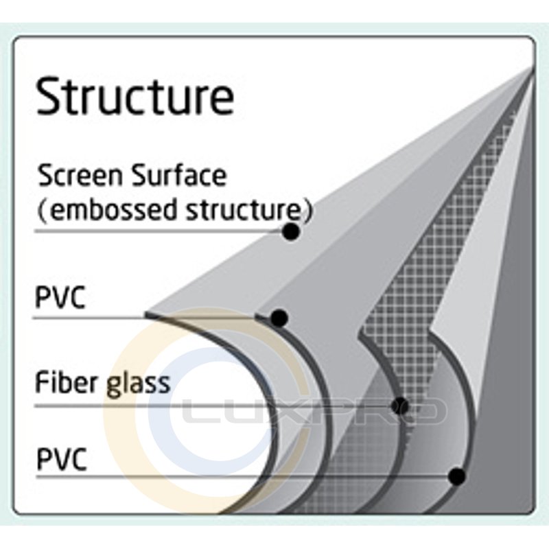 - Полотно складається з 4-х різних верств, включаючи скловолокно, що забезпечує довгостроковість експлуатації полотна екрану, запобігає появі хвиль і втрати світла.