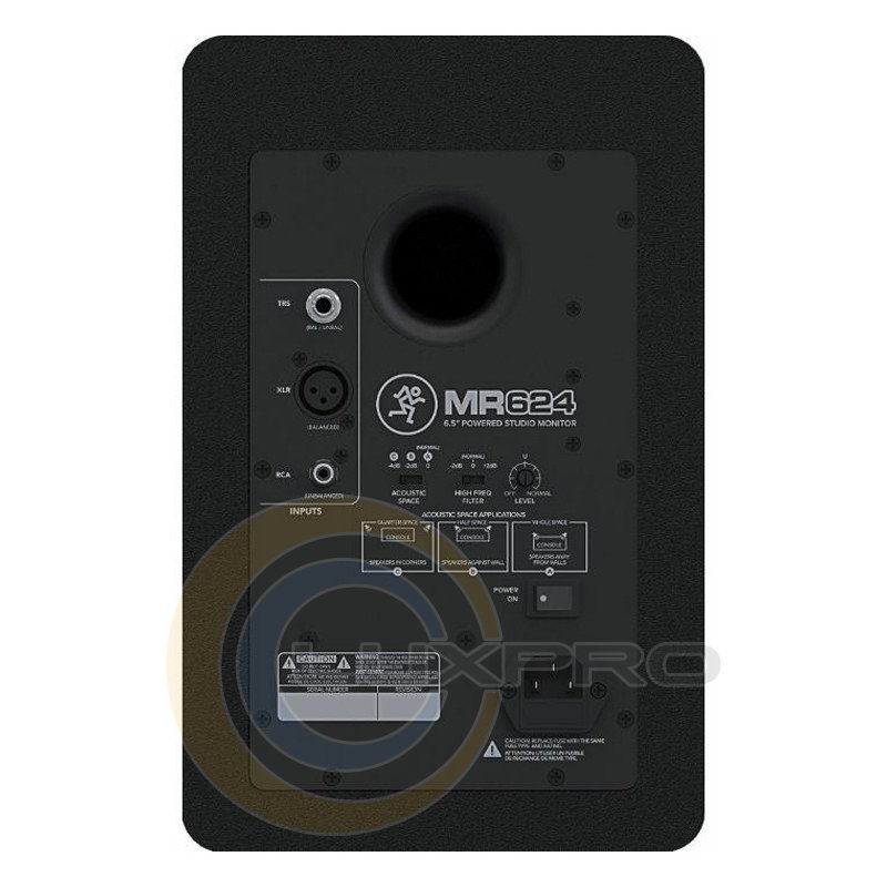 MACKIE MR624 - активний студійний двосмуговий монітор потужністю 65 Вт. Вбудований вуфер розміром 6,5 '', 1 '' твітер, підсилювач на дві смуги, «логарифмический» хвилевід для надширокої зони «sweet spot», а також ручка Acoustic Space для регулювання басів в залежності від відстані монітора до стіни. Монітор MACKIE MR624 оптимально підійде для звукоинженеров, музикантів і продюсерів.Студійні монітори серії MR призначені для передачі чудового і точного студійного звучання. Рекомендовані виробником для запису, редагування, мікшування в професійних і домашніх студіях, телевізійних і радіо студіях, в домашніх кінотеатрах та інших мультимедійних додатках.Логарифмічний хвилевід сприяє дисперсії високочастотної складової без зміни робочої осі прослуховування НЧ-динаміка і рівномірному переходу до Середньочастотні діапазону. Оптимальне розміщення активної зони твітера на одній осі з НЧ-випромінювачем, забезпечує акустичне вирівнювання високих і низьких смуг для ідеального балансу між артикульованими високими і читаються середніми частотами.Студійний монітор MACKIE MR624 легко адаптується до вашого робочого простору для забезпечення рівної АЧХ за допомогою двох регульованих фільтрів. Acoustic Space (акустичний простір) - змінює загальний відгук, щоб відповідати більшості конфігурацій.Характеристики: