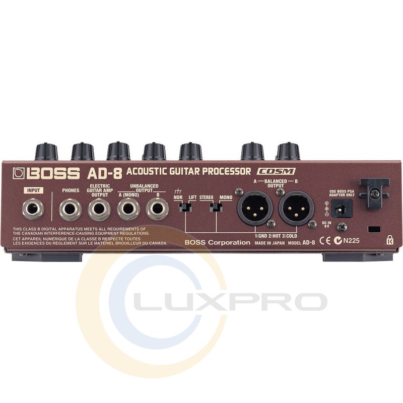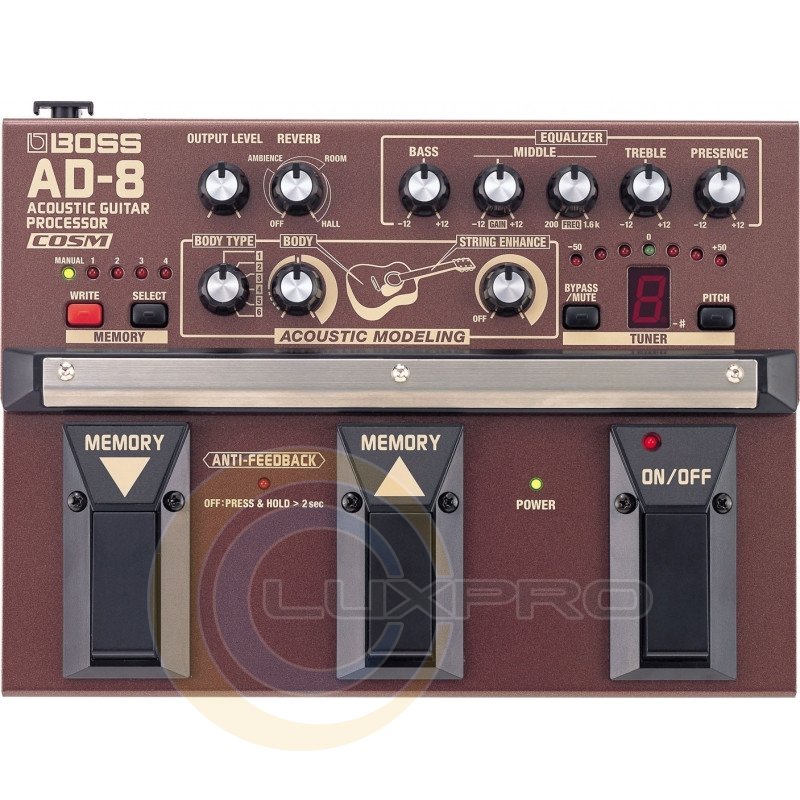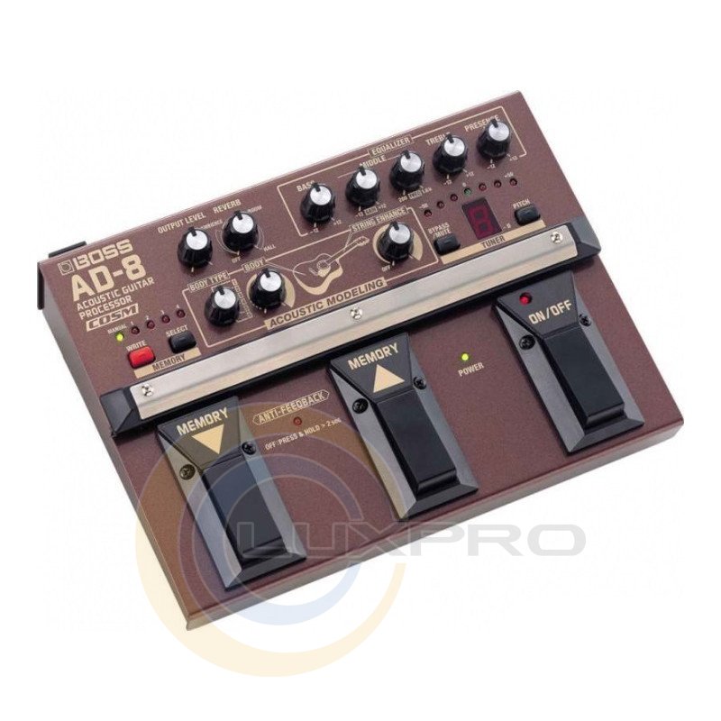 BOSS AD8 - підлоговий звуковий процесор для акустичних гітар. Процесор ефектів BOSS AD8 використовує технологію моделювання звукових об'єктів COSM. Використовуючи цю технологію, процесор відтворює 6 фізичних моделей корпусів дорогих акустичних гітар Martin, Gibson, Guild, Jose Ramirez, а також 3 моделі мікрофонів Neumann і AKG, що імітують мікрофонний знімання гітарного звуку. Звучання може бути скориговано за допомогою управління резонансу корпусу гітари Body. Регулювання String Enhance привносить в звучання красиві обертони, створювані власної реверберацией струн, що особливо ефектно при грі пальцевим методом.