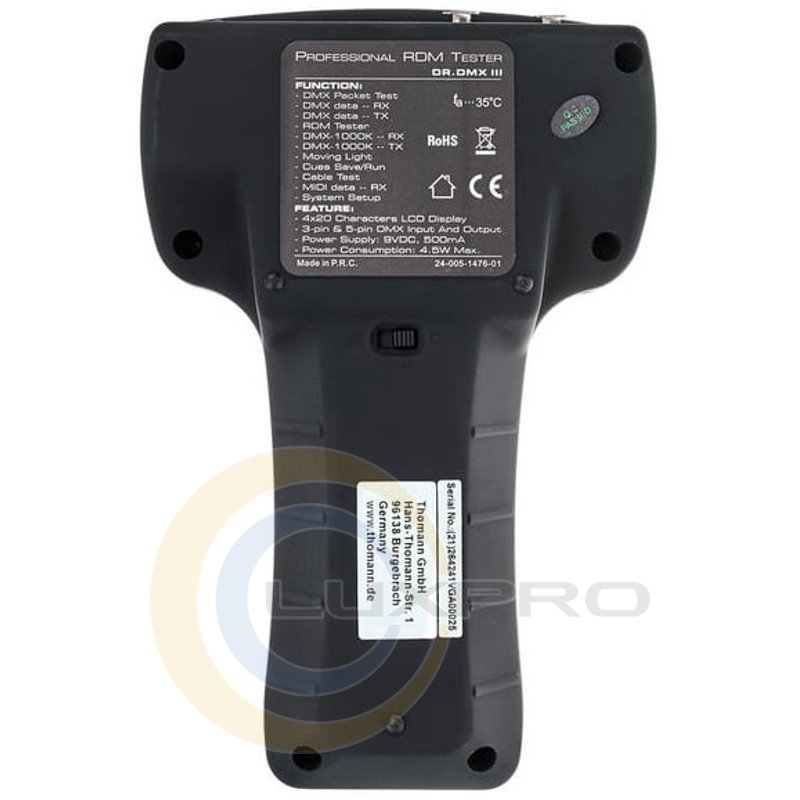 American Audio Dr-DMX III - DMX тестер для DMX і MIDI інтерфейсів, аналогових і цифрових кабелів, одночасне тестування до 10 світлоприладів, великий ЖК дисплей з підсвічуванням. Dr-DMX III дозволяє перевірити будь-який сигнал DMX за допомогою декількох параметрів, а також створення DMX послідовності з метою тестування або резервного копіювання. Сумісний з RDM протоколом.