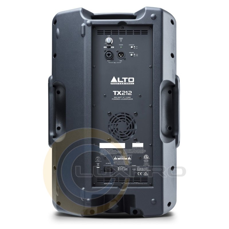 Alto Professional TX212 здатна витримувати будь-які умови транспортування завдяки міцному корпусу, виготовленого з литого під тиском поліпропілену. Додатково передбачена металева решітка та гумові ніжки, які забезпечують максимальний захист. Вбудована ручка на верхній панелі ще більше спрощує транспортування. Крім того, присутній стандартний роз'єм для установки на вертикальну стійку. Спеціальна форма кабінету дозволяє використовувати акустичну систему в якості сценічного монітора. На задній стінці знаходиться один вхідний комбінований роз'єм 1/4 "Jack- XLR з перемикачем мікрофонного / лінійного рівня для додаткової гнучкості, а також один вихідний роз'єм XLR. Передбачено поворотний регулятор рівня вхідного сигналу.