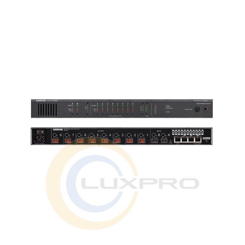 SHURE MXWANI8 - мережевий аудіо інтерфейс SHURE MXWANI8, 8-канальний, для бездротової системи Microflex ™ Wireless. Аналоговий аудіоінтерфейс SHURE MXWANI8 є центральною точкою для підключення системи Microflex Wireless до телеконференціонному або презентаційному устаткуванню. Інтерфейс дозволяє поканально виводити 8 аналогових аудіосигналів і має вбудований 4-портовий комутатор.Характеристики: