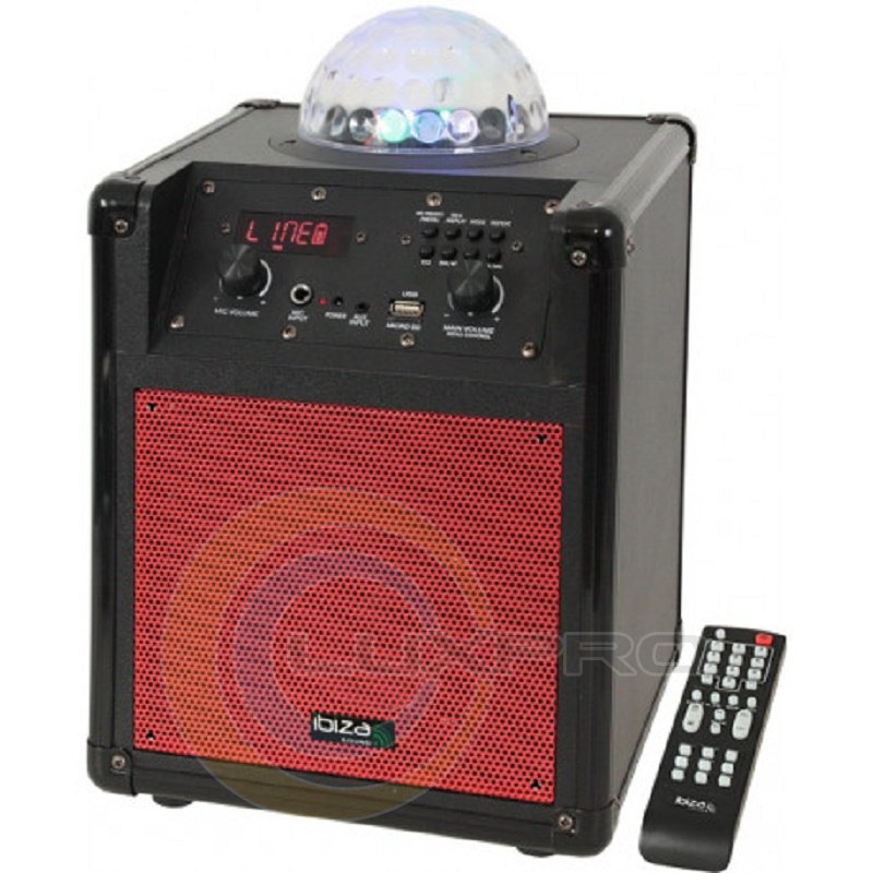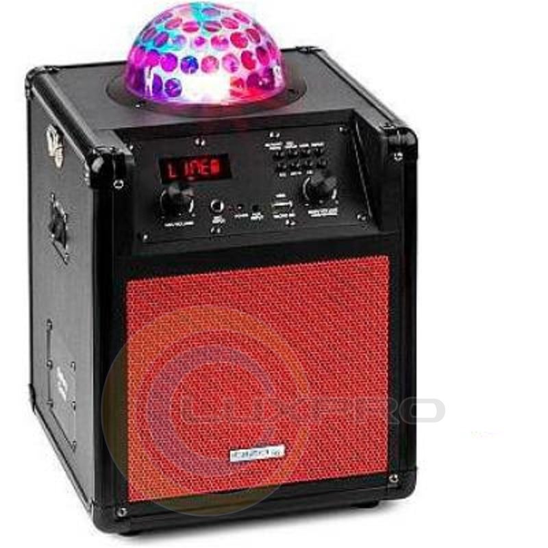Портативна переносна акустична система IBIZA KUBE60-RE з живленням від вбудованого акумулятора або від мережі живлення, з підсилювачем і світловим ефектом RGB для мобільного і караоке використання.