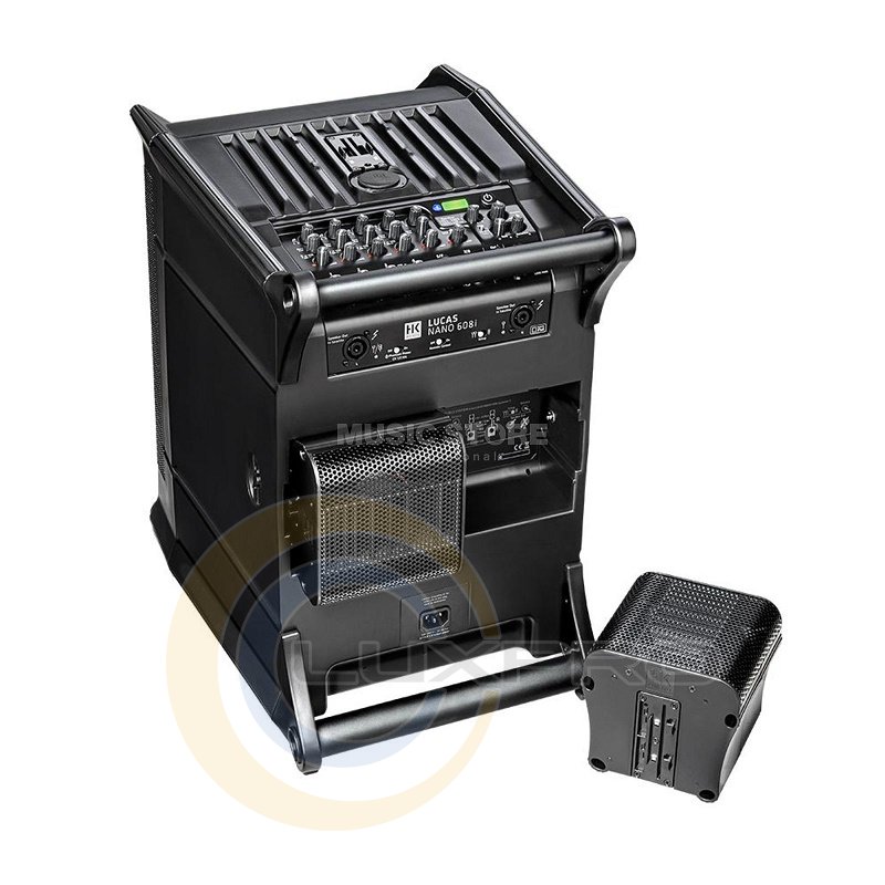HK AUDIO Lucas Nano 608i - портативна система звукопідсилення, включає активний сабвуфер і пару невеликих за розмірами сателітів. Потужність така ж, як у версії Lucas Nano 600, але передбачено більшу кількість входів і розширено функціонал. Система призначена для естрадних артистів, сольних музикантів, невеликих груп і діджеїв.