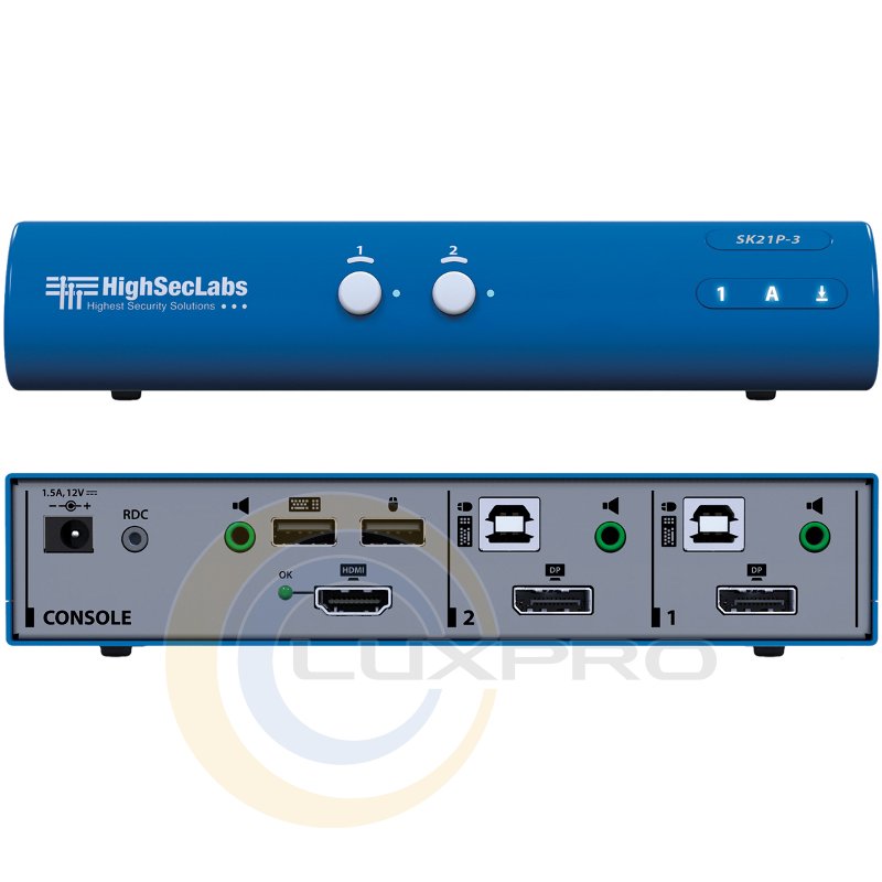 Kramer SK21P-3 - безпечний 2-портовий комутатор DisplayPort комутатор з малим форм-фактором. Це дозволяє користувачам обмінюватися периферійними пристроями - клавіатурою, мишею і монітором - між двома різними мережами / комп'ютерами рівня безпеки. Він забезпечує максимально можливу ізоляцію між двома підключеними комп'ютерами і сертифікований NIAP Common Criteria Protection Profile версії 3.0 (PP3.0).