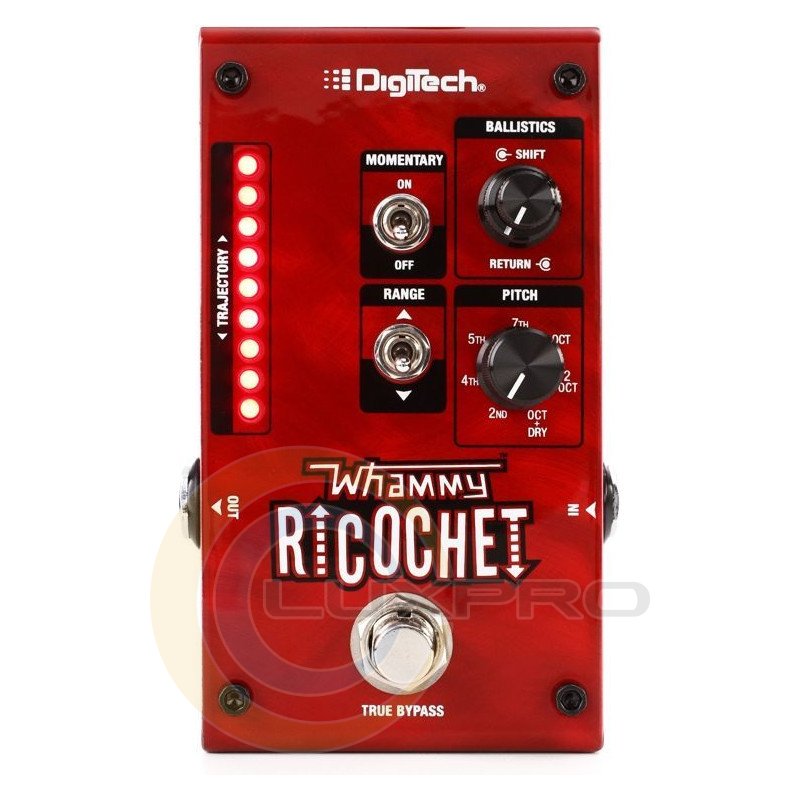 Процесор DIGITECH Whammy Ricochet має фіксуючий режим ножного перемикача - натиснувши кнопку, ви фіксуєте настройки (крок зсуву вгору або вниз) і залишаєтеся в цьому режимі. Вертикальний світлодіодний індикатор візуально відображає траєкторію зсуву. Всі ці елементи управління об'єднані в єдине ціле, щоб створити класичний Whammy зрушення висоти тону, а також нові звуки, ніколи досі не існували.