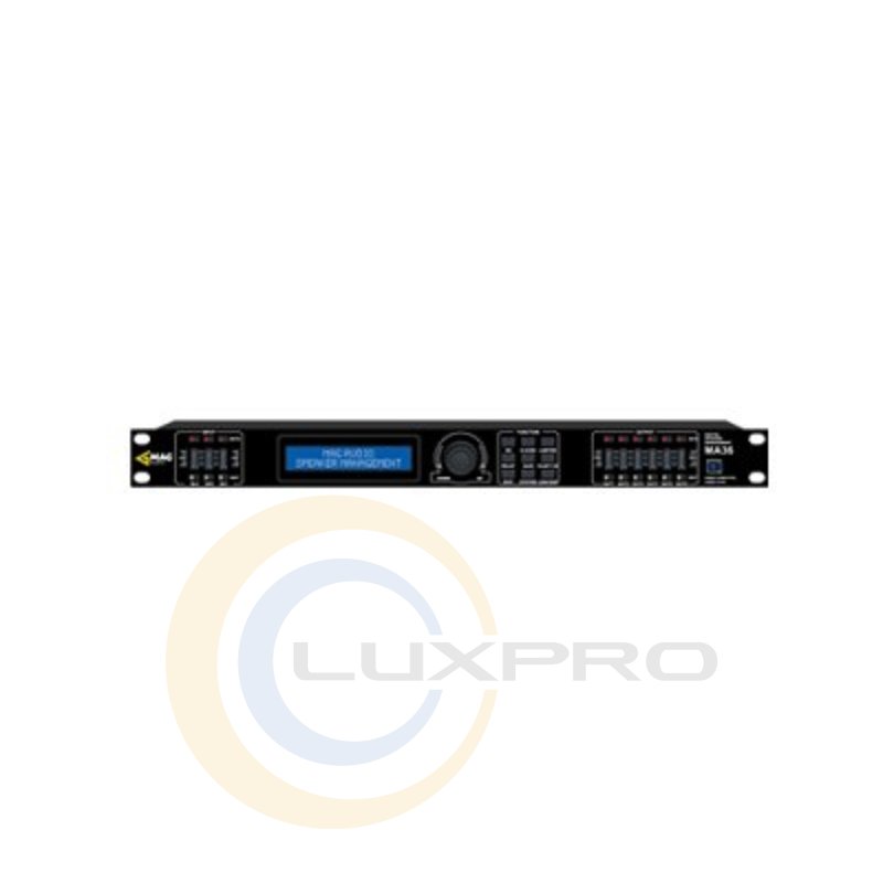 MA 36 - 1U висотою з 3 входовую і 6 вихідними каналами акустичний процесор для управління акустикою з можливістю захисту і моніторингу. Він оснащений 24-бітовими A / D і D / A перетворювачами, 32-бітовим DSP, 3 аналоговими входами і 6 аналоговими виходами з можливістю матричного управління. Кожен вхідний канал має функції Мьюта, затримки 0-1000 мс, перемикача фази сигналу і 6-смугового параметричного еквалайзера з налаштованим типами фільтрів. З виділеним програмним комплексом він ідеально підходить для фіксованих інсталяцій та мобільних комплектів.Характеристики: