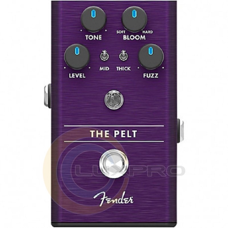 Fender PEDAL THE PELT FUZZ - педаль гітарних еффектів, ефект фузз, кремнієві транзистори, ручки регулювань - Level, Tone, Bloom, Fuzz, два тумблера - mid, thick.
