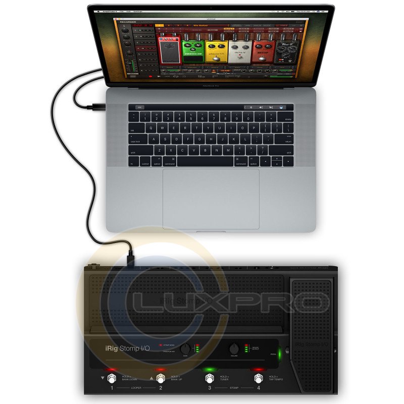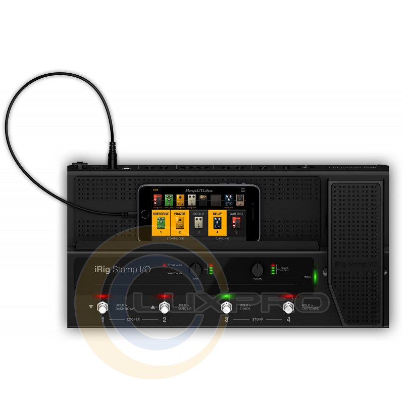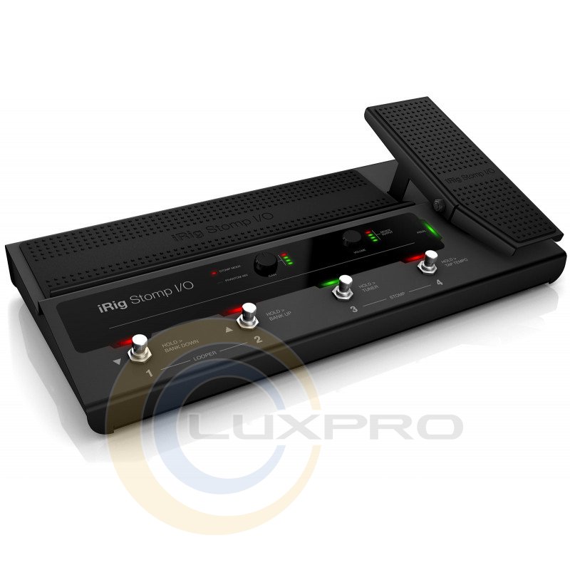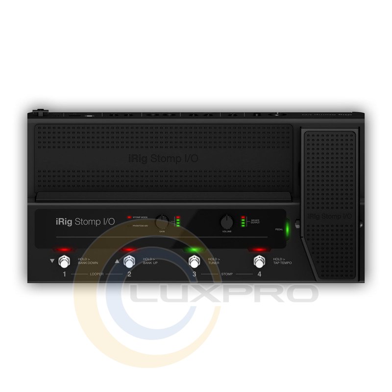 IRIG STOMP I/O - аудіо інтерфейс, управління: 4 ножних перемикача, педаль експресії з оптичним перемикачем, регулятори Gain і Volume, перемикач фантомного живлення, аналогові входи: комбінований Neutrik® вхід Hi-Z / Mic / Line, аналогові виходи: 2 балансних виходу 1/4 "TRS Jack + 1 / 4 "вихід для навушників, цифрові виходи: MIDI-вхід / вихід з двома додатковими входами 1/4" для перемикача / педалі, B-Type USB для підключення до Mac / ПК, Mini-DIN "iOS" роз'єм, розміри: 415 х 210 х 72 мм, вага: 3.2 кг, живлення: по USB або через адаптер DC (в комплекті), виробництво: Італія.IK MULTIMEDIA IRIG STOMP I / O - це новий підлоговий USB-контролер, який об'єднує професійний сертифікований MFI звуковий інтерфейс з MIDI-входом / виходом для iPhone, iPad, Mac і ПК. Він поставляється в комплекті з сучасної гітарної, вокальної обробкою і записуючим програмним забезпеченням для гнучкості і зручності використання як на сцені, так і в студії. Міцний і надійний, але зручний в транспортуванні, iRig Stomp I / O оснащений чотирма вбудованими металевими кнопками, а також педаллю експресії з перемикачем зі світлодіодними індикаторами.Для подальшого розширення можливостей управління ви можете підключити до двох додаткових перемикачів або педалей. Порти MIDI IN / OUT дозволяють легко управляти зовнішніми процесорами, коли iRig Stomp I / O використовується в якості автономного педального MIDI-контролера без підключення до нього будь-якого пристрою або комп'ютера.Комбінований вхід з фірмовим роз'ємом Neutrik® 1/4 "XLR працює як з інструментами так і з мікрофонами, включаючи конденсаторні мікрофони з перемикається фантомним живленням 48 В. Балансний стереовиход підключається до зовнішнього підсилювача, мікшеру або активної акустичної системи, а вихід для стереонавушників 1 / 4 "доступний для безшумного моніторингу. Регулятори вхідного посилення і вихідної гучності доступні на передній панелі, кожен зі своїм індивідуальним світлодіодним VU-Meter індикатором, для швидкої і простої настройки рівнів.Гітарний процесор IK MULTIMEDIA IRIG STOMP I / O також використовує концепцію універсальності на абсолютно новому рівні, поєднуючи інтелектуальне високотехнологічне апаратне пристрій з неймовірною колекцією професійного програмного забезпечення і додатків вартістю понад $ / € 800.Характеристики: