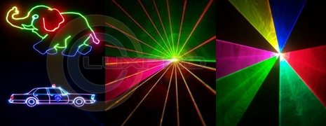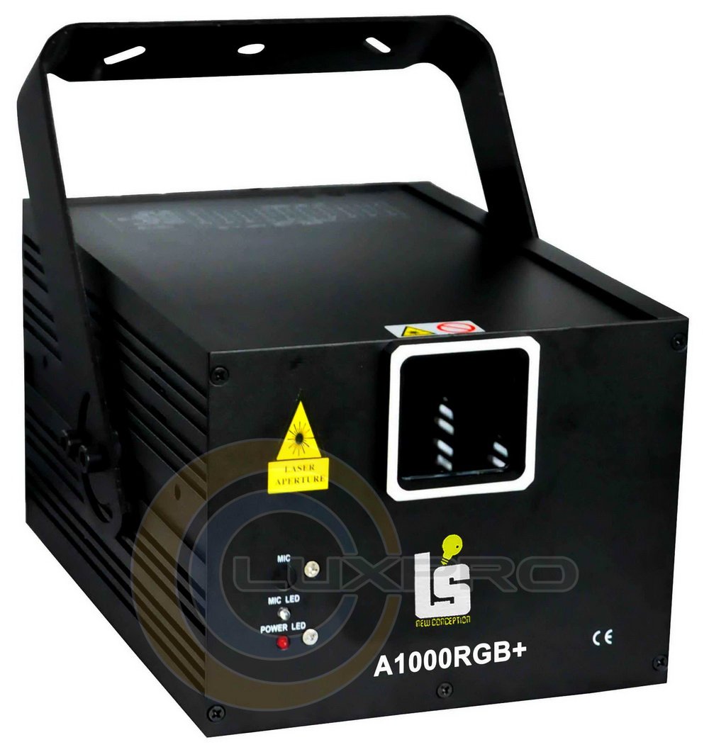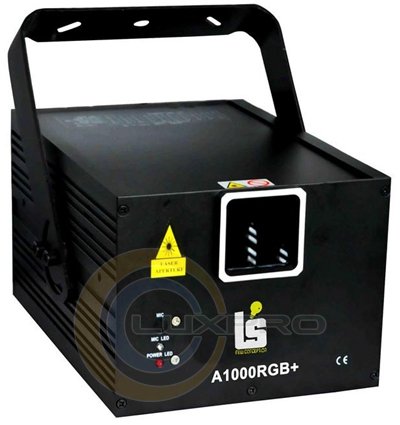 LS-A1000 RGB + RGB повнокольоровий анімаційний лазер на гальванометрах: 25кппс, 128 графічних програм і анімаційне шоу, стробування, обертання, сканування, зміни розміру малюнка, і т.д. LS-A1000 RGB + відмінне рішення для провидіння нічних заходів.