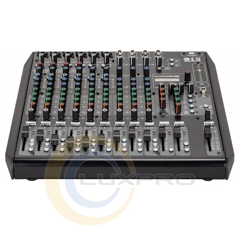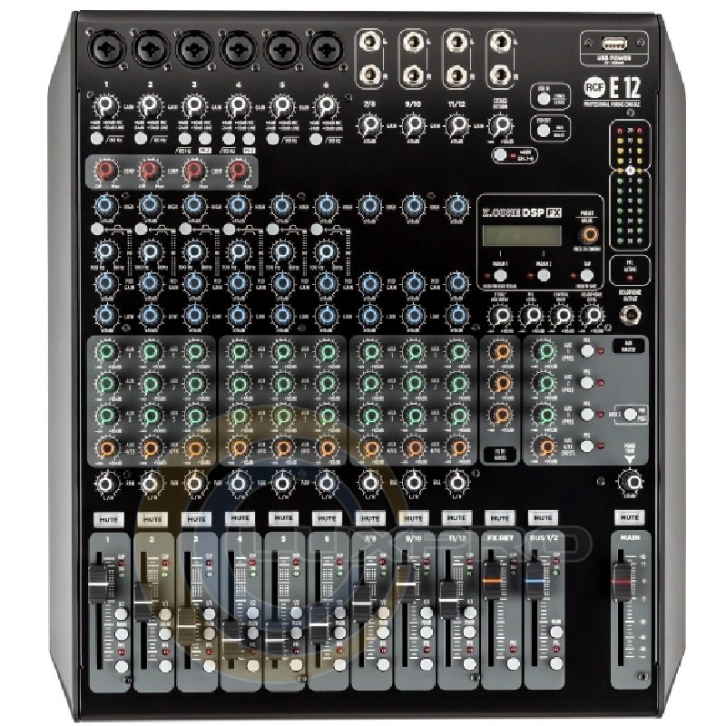 RCF E12 являє собою 12-канальний мікшерний пульт з висококласними ефектами і еквалайзер. Дана модель надає шість мікрофонних передпідсилювачів студійного якості з запасом гейна до 54 дБ і комбінованими роз'ємами. Два лінійних входу можуть перемикатися в режим Hi-Z. Вхідна секція також оснащена трьома стерео лінійними входами і стерео поверненням. Вхідні канали з 1 по 4 мають компресор з одним регулятором. Для кожного з шести моно каналів передбачений 3-смуговий еквалайзер, включаючи регулятори високих, низьких частот, а також напівпараметричний середню смугу з можливістю вибору частоти. Вхідні стерео канали мають звичайний трьохсмуговий еквалайзер.