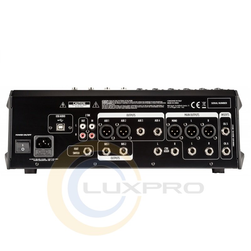 Задня панель пульта мікшера RCF E12 володіє великою кількістю роз'ємів для підключення додаткового звукового обладнання. Тут ви зможете знайти два допоміжних виходу AUX на роз'ємах XLR і два на роз'ємах 1/4 "Jack, стерео входи / виходи RCA, два 1/4" Jack інсерта для каналів 5 і 6, дві вихідні шини з роз'ємами 1/4 "Jack , вхід для ножного перемикача, два виходи CTRL Room 1/4 "Jack, а також головні моно / стерео виходи на роз'ємах XLR і 1/4" Jack. Додатково присутній порт USB Audio Type B.