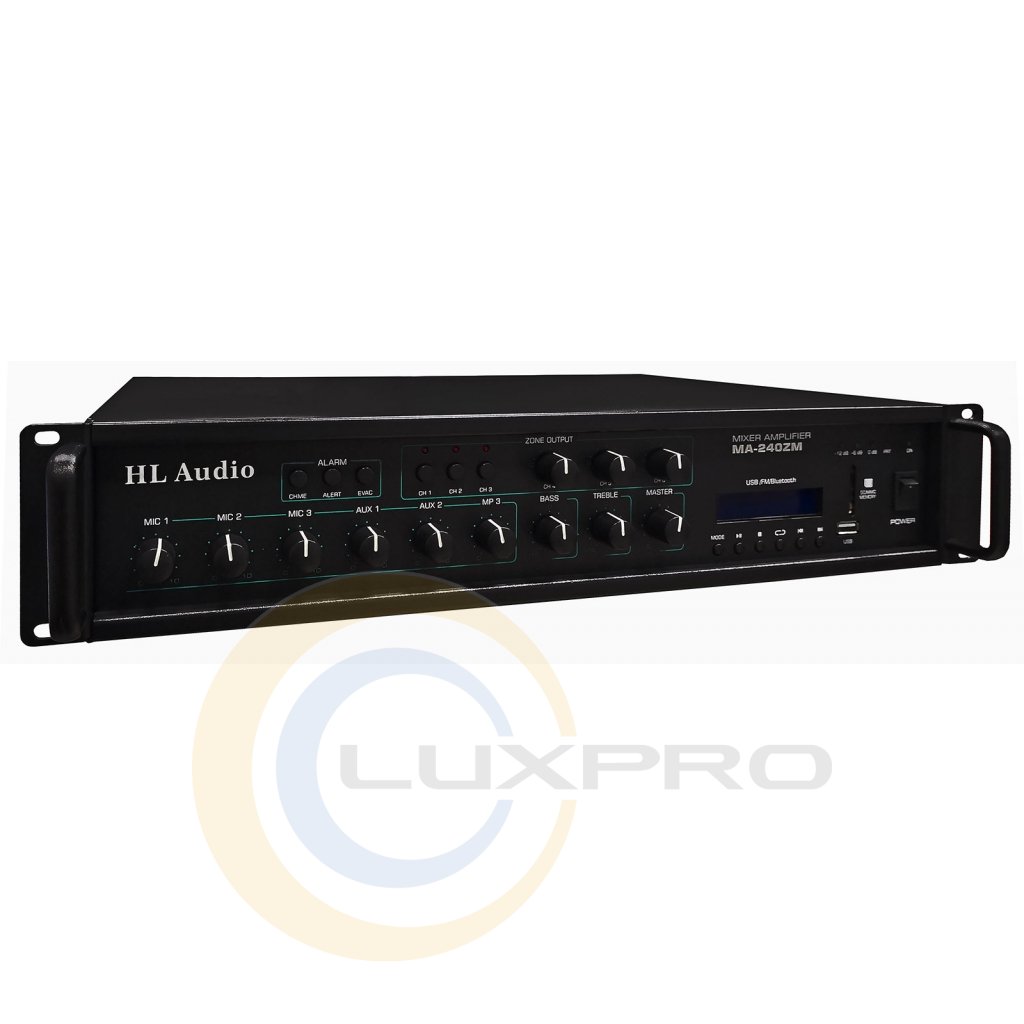 L Audio MA240ZM Public Address Amplifier є підсилювач потужності трансляційного типу, який підтримує роботу з лініями 70/100 В. Новинка працює в діапазоні звукових частот від 60 гц до 20 кГц і здатна забезпечити до 240 Вт потужності. Зверніть увагу на наявність вбудованого медіа програвача з підтримкою MP3 / SD Card / Bluetooth. Передбачена можливість підключення зовнішніх USB накопичувачів. Додатково в наявності FM радіоприймач.Характеристики: