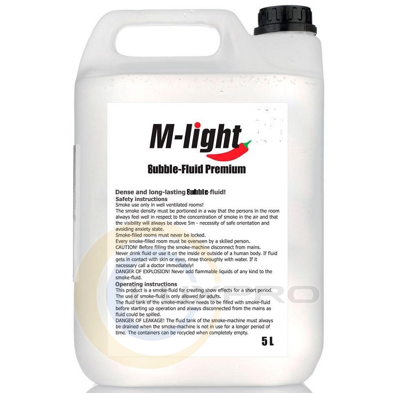 M-Light Bubble Fluid - рідина для генераторів мильних бульбашок. Рідина протестована і відмінно підходить для роботи з будь-якими генераторами бульбашок. Ємність каністри 5 л.