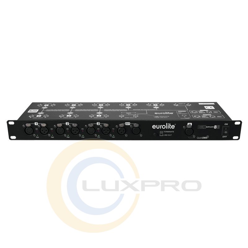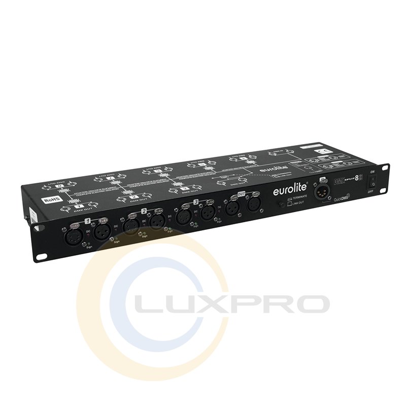 Eurolite DMX Split 8X Splitter - спліттер (розподільник) для сигналу DMX, 1 вхід-вихід прямий + 8 виходів, всі виходи оптоізолірованние, для кожного входу і виходу є 3-х і 5-ти контактні роз'єми, живлення 220В / 50Гц, 5Вт. Рекове кріплення. Розміри: 483х145х45 мм. Вага - 2 кг.