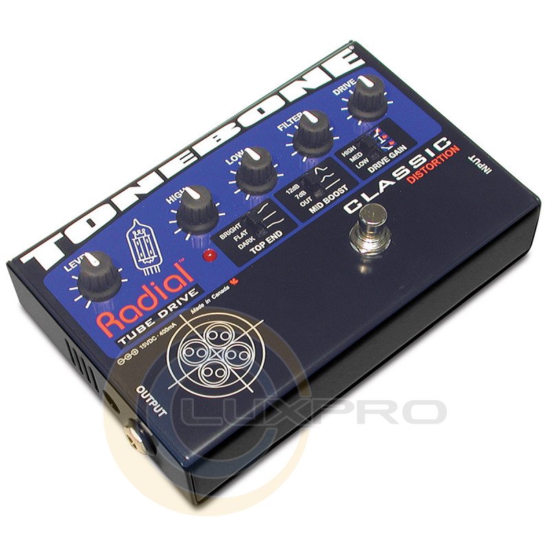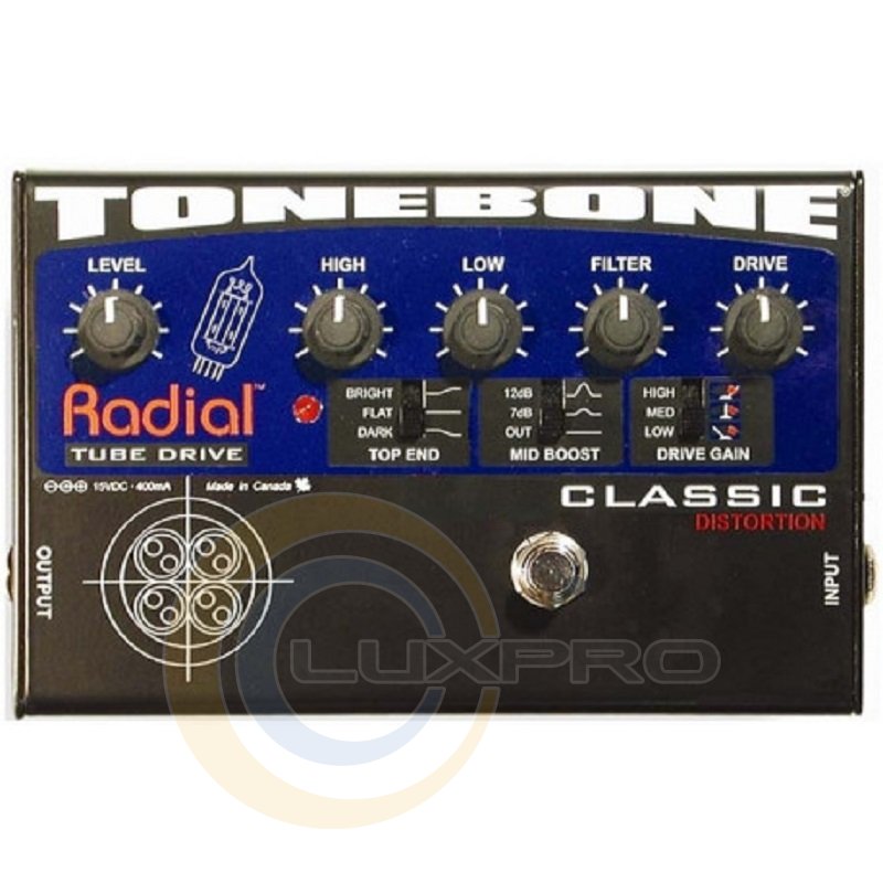 Педаль Radial Classic передпідсилювач, 3-позиційний перемикач додаткового передпідсилення (0, + 7 або +12 дБ), фільтр низьких частот з регулятором частоти зрізу, лампа 12AX7, холодний байпас.Характеристики: