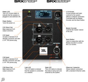 Безпрецедентний контроль: Повний набір регульованого користувачем DSP обумовлений SRX800 серії потужних борту 400 МГц DSP SHARC включає 20 речей, в 2 секунди затримки, генератори сигналів, змішуючи введення, контролю підсилювача і 50 користувальницьких пресетів. Крім того, система може включати V5 JBL налаштувань забезпечуючи сумісність з нашими флагманських VERTEC і VTX туристичних систем. Вбудований РК-екран підтримує швидке встановлення та налаштування.Характеристики: