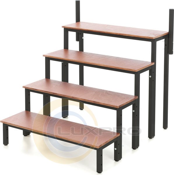 Сходи шириною 100 см, вхід 32,5 см, одинарний. Елементи сцени "Praktikus 750", включаючи підлогу сцени. Блок з бука, завтовшки 21 мм, поверхня з натуральним УФ-лаком B1, середній коричневий або чорний з покриттям (для приміщень).