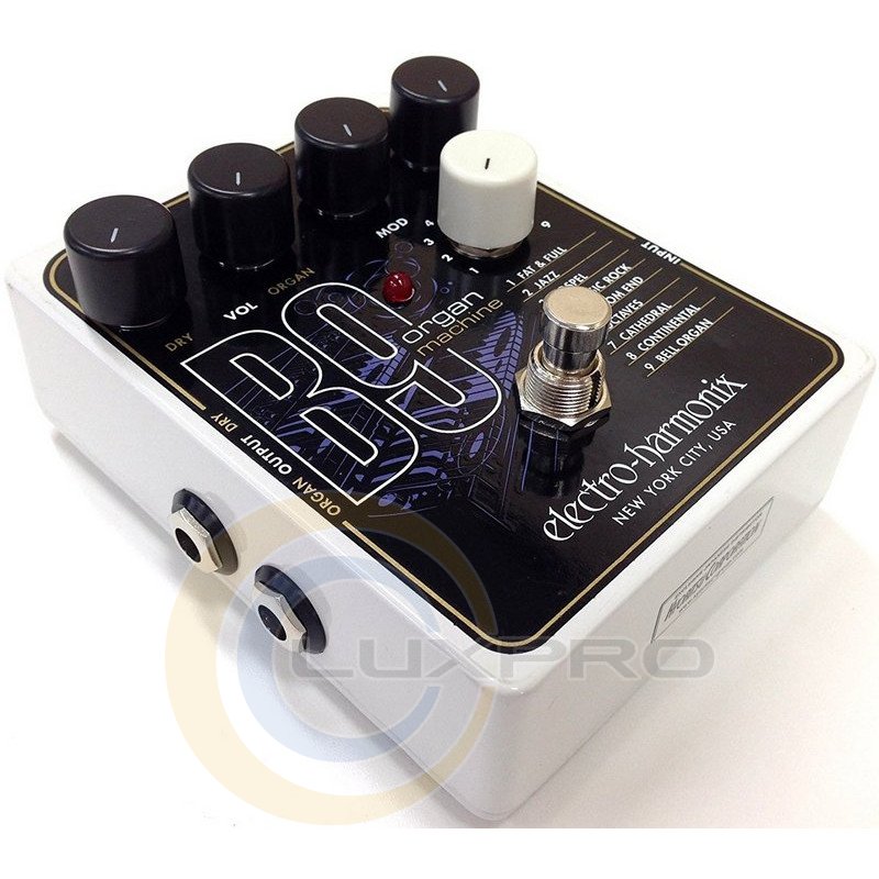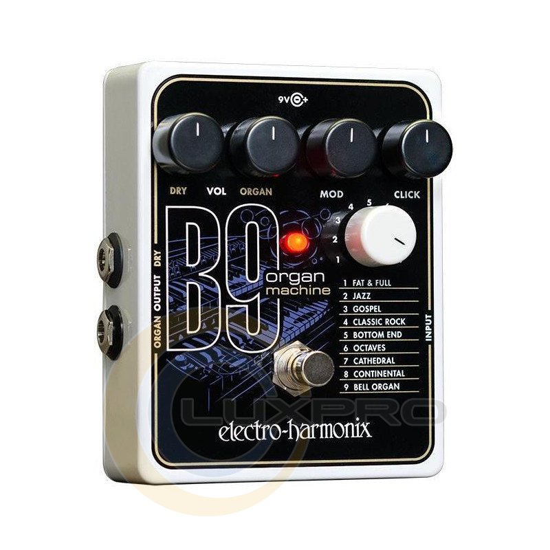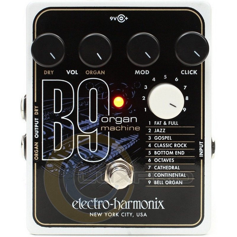 Педаль Electro-Harmonix B9 Organ Machine застосування різноманітних ефектів звучання органу. Метою розробників було створити зручну педаль, яка відтворить звук органу в кінчиках пальців гітариста. Педаль ефектів Electro-Harmonix B9 Organ Machine трансформує вашу гітару або клавіші. Пристрій наділене 9 ефектами, які можна вибрати за допомогою регулятора, дві окремі регулювання гучності - для обробленого сигналу і необробленого, так що їх можна змішувати в потрібній пропорції.Ручки Mod і Click дозволяють експериментувати зі звуком кожного з пресетів. Причому на кожному з пресетів вони працюють по-різному. Гітара емулятор звучання органу має двома виходами Dry і Organ, тому при необхідності оброблений і необроблений звук можна направити в різні підсилювачі або ланцюжка ефектів.Характеристики: