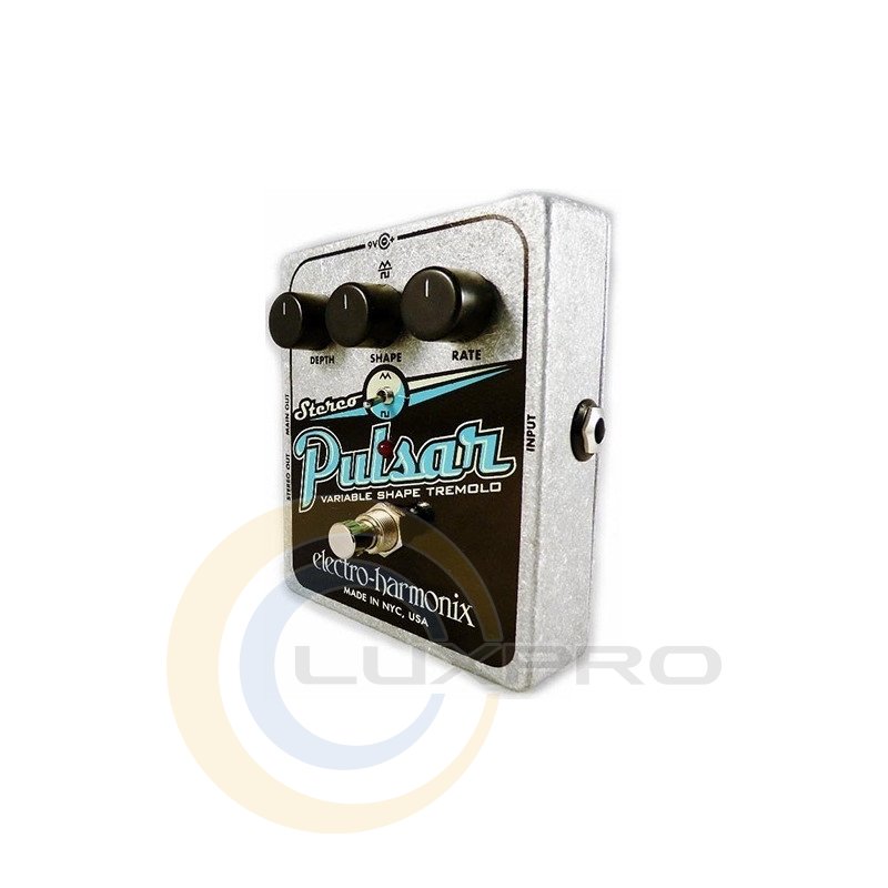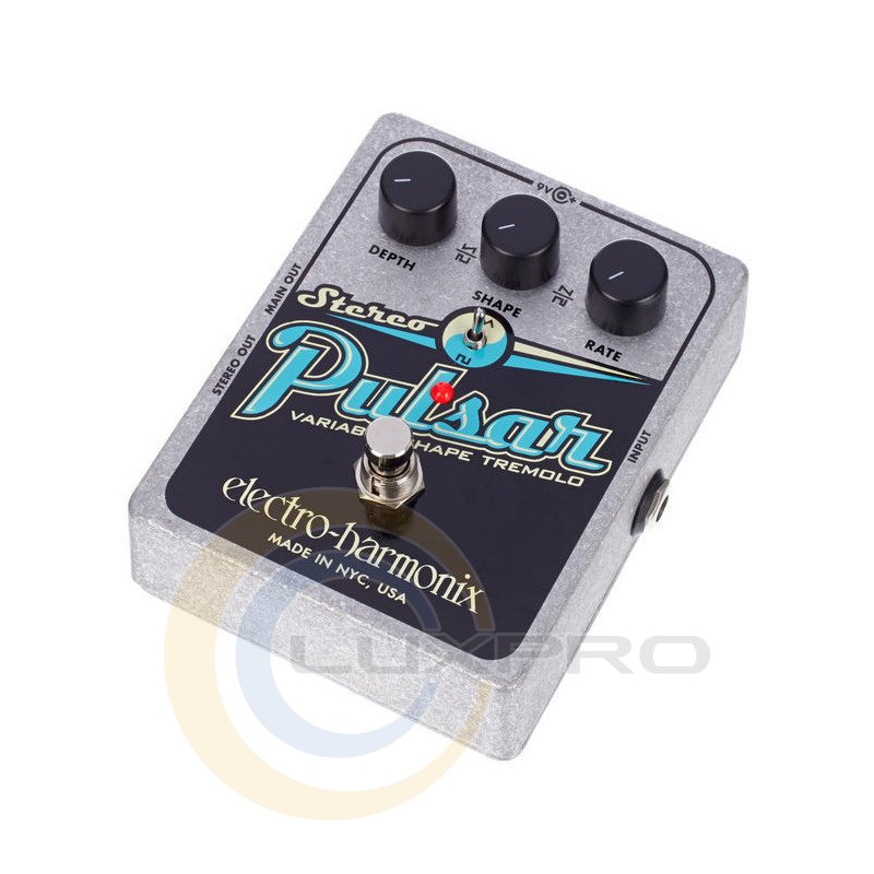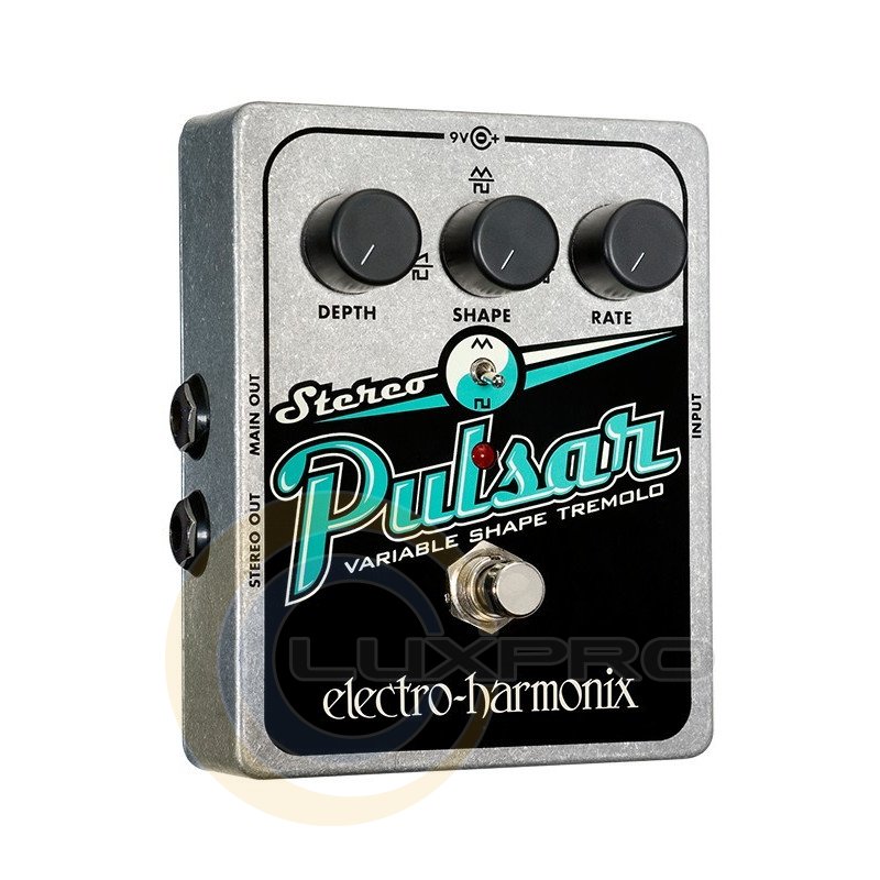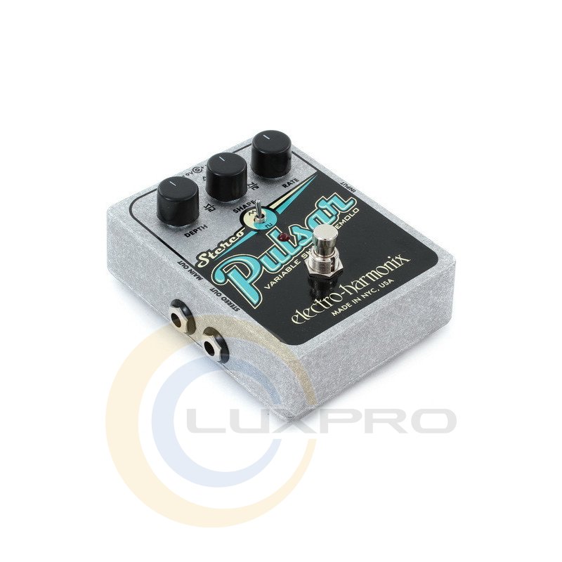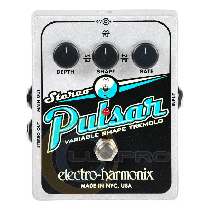 Педаль Electro-Harmonix Stereo Pulsar ефектів для електрогітари, яка дає ефект тремоло і стерео обсягу. Перемикач Wave Form дозволяє змінювати вид модуляції з трикутної в квадратну. Змінити глибину модульованого сигналу здатний регулятор Depth. Регулятор Wave, спільно з перемикачем, надає вам можливість зміни типу хвилі, що виходить при включеному режимі ефекту. Третій регулятор Rate здійснює контроль над швидкістю ефекту. Ви зможете створити будь-який тип стерео тремоло від вантажного до ультрасучасного.Характеристики: