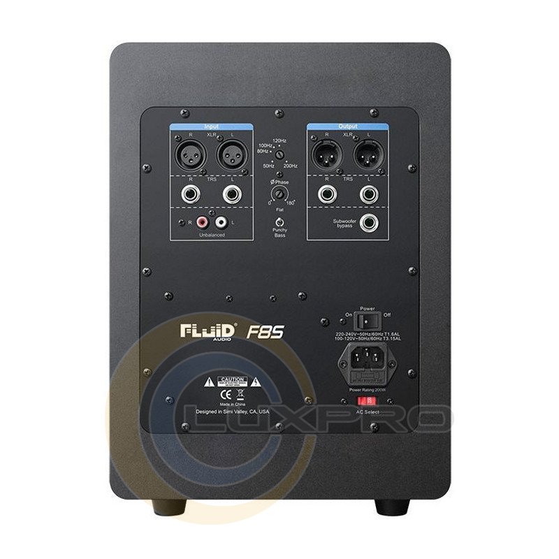 Активний сабвуфер Fluid Audio F8S до лінійки Fader і призначений для використання як в студії, так і в побутових умовах в якості компонента для домашнього кінотеатру або стереосистеми. Студійний сабвуфер FLUID AUDIO F8S виконаний в корпусі з MDF і обладнаний 8 '' динаміком з паперовим дифузором і високотемпературної звуковою котушкою. Вбудований підсилювач працює в класі D і розвиває 200 Вт вихідної потужності. У сабвуфере FLUID AUDIO F8S є інфразвуковий фільтр, захист від перевантаження і перегріву, радіочастотних перешкод, а також від клацань при включенні / виключенні живлення.Активний сабвуфер FLUID AUDIO F8S - призначений для студій звукозапису, ігор, домашніх кінотеатрів і т.д. Підсилювач 200 Ватт класу D. Сабвуфер дозволяє почути кожну деталь при 30 Гц - і володіє компактним розміром. Має змінну регулювання фази для тонкої настройки, оптимальне узгодження з вашими L / R моніторами (0-180 градусів), фільтр 50-200 Гц і 80 Гц фільтр ВЧ (використовується з ножним перемикачем). Tcnm XLR і Jack входи / виходи, RCA входи, вихід для ножної педалі.Комутаційні можливості FLUID AUDIO F8S представлені балансними входами XLR × 2 і TRS × 2, а також небалансних на роз'ємах типу RCA. Для підключення активних моніторів в наявності є балансні XLR- і TRS-виходи, плюс передбачено гніздо для ножного перемикача, що входить в комплект поставки. З органів управління на сабвуфере є регулятори частоти зрізу кросовера (50 ... 200 Гц) і фази, а також спеціальний перемикач, що дозволяє вибрати одну з двох фіксованих налаштувань АЧХ ( "Flat" або "Punchy"), що визначають характер баса.Харaктеристики: