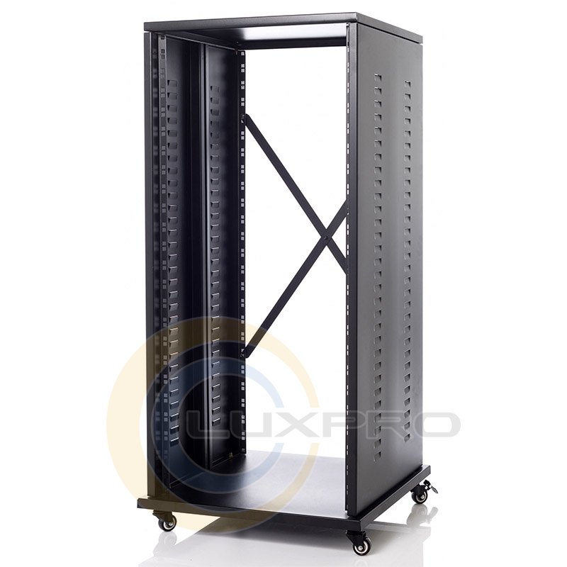 BESPECO STRK24 - металева рек-стійка для студії на коліщатах. Висота 24U, ширина 19". Колір: чорний, фарба не містить токсичних речовин. Має Х-подібний стабілізатор стійкості.