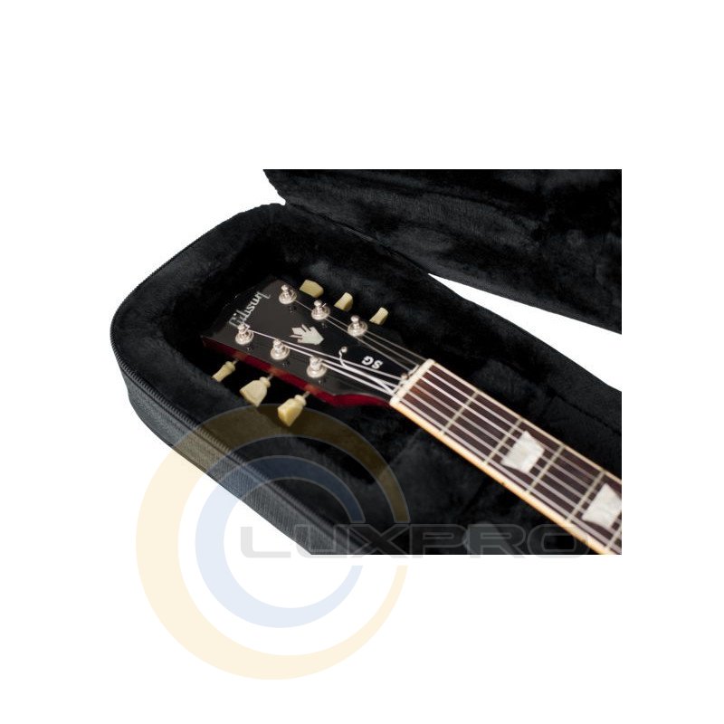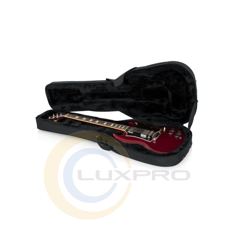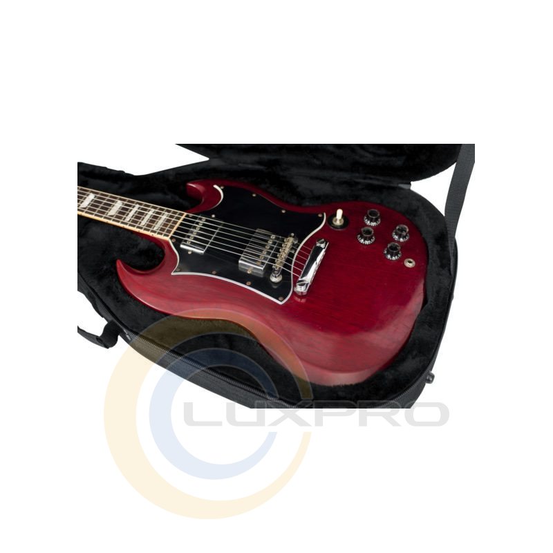 GATOR GLSG - кейс для електрогітари типу SG, нейлон з EPS пінним наповнювачем, внутрішня оббивка з м'якого плису, посилена область для грифа, ручки і ремінь для перенесення, внутрішній відсік для аксесуарів, внутрішні розміри: 1 026 х 340 х 71 мм, зовнішні розміри: 1085 х 419 х 175 мм, вага: 2.43 кг.