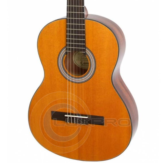 Класична "іспанська" акустична гітара, розмір 3/4, верхня дека - кедр, бічна і задня дека - махогон, гриф - махогон, колір - натуральний. Ідея інноваційної колекції PRO-1 Acoustic Collection - створення гітари, на якій було б легко грати, але при цьому вона відповідала б багатовікової традиції Epiphone з чудовою якістю збірки, насиченим тоном і красивим дизайном. PRO-1 Classic створений за зразком кращих в світі класичних гітар, з використанням тих же сортів дерева. Класичні гітари славляться своїм неповторним, чистим звуком. Збалансований звук даної гітари і функції PRO дозволяють навіть новачкові легко знайти своє унікальне звучання. Дизайн PRO-1 Classic являє собою: верхня дека з кедра, а збоку, ззаду дека і гриф - з махагони.