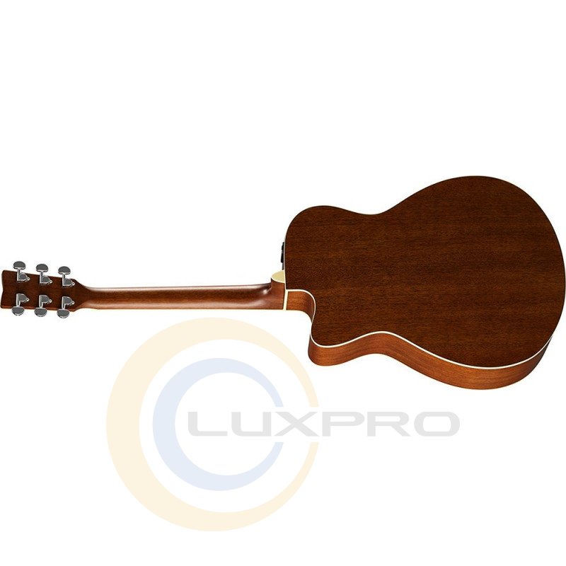 YAMAHA FSX800C (SB) - електроакустична гітара, верхня дека: цільна ялина (Solid Spruce), нижня дека: нато / окуме (Nato / Okume), обичайка: нато / окуме (Nato / Okume), глибина корпусу: 90-108 мм, гриф: нато з палісандровою накладкою, бридж: палісандр, верхній поріжок: 43 мм, механіка: хром, звукознімачі: SYSTEM66 + звукознімач SRT, управління: 3-смуговий еквалайзер з параметричною серединою, вбудований тюнер.