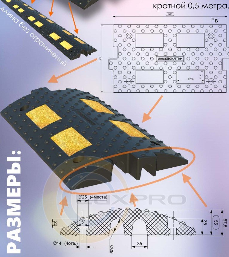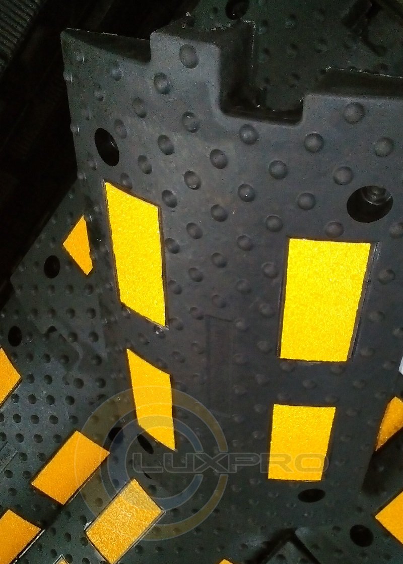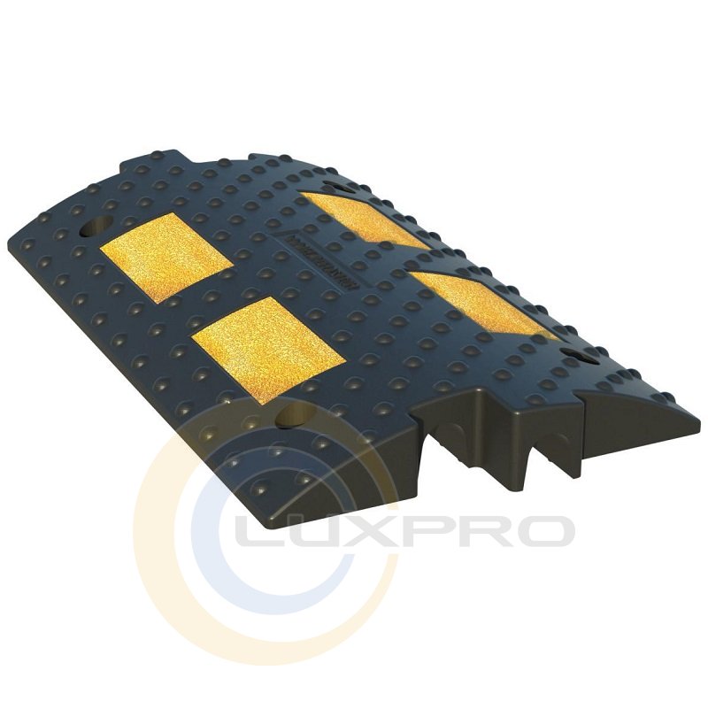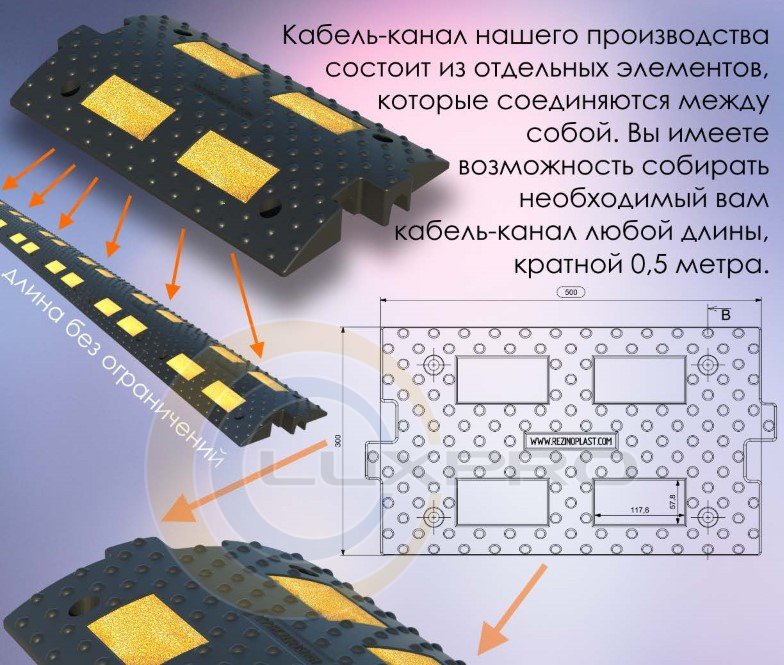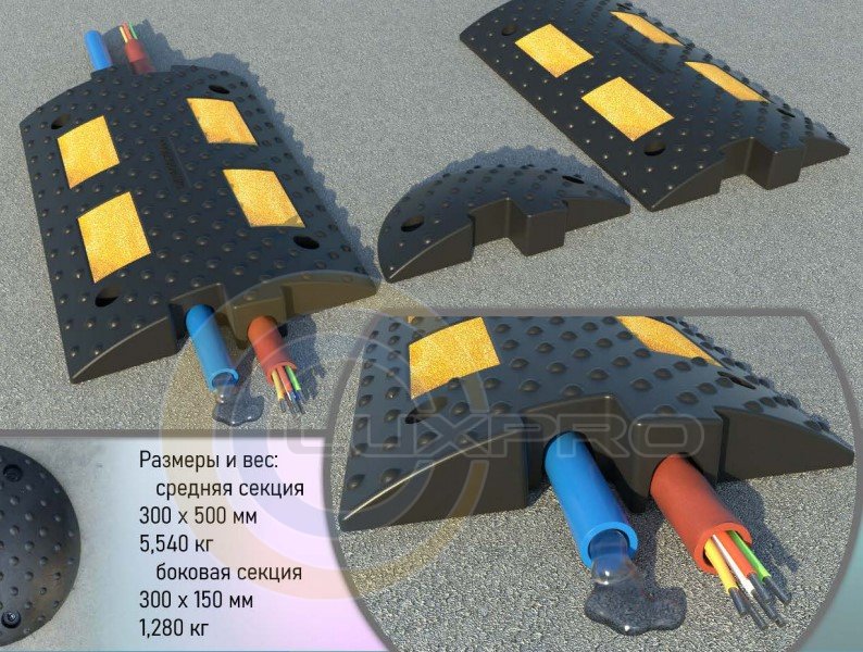 Кабелі - канали використовуються в місцях проведеннях масових заходів на спортивних і концертних майданчиках, при проведенні вантажно - розвантажувальних робіт в складських приміщеннях, в місцях з підвищеною прохідністю. Це універсальна конструкція з засобами для укладки пазами, призначена для захисту високовольтних кабелів, пожежних і садових шлангів, шнурів і кабелів, які схильні до ризику деформації шляхом механічної дії. Надійно фіксується на дорожніх і підлогові покриття. Виготовляється з високоякісної гуми з підвищеними Харктеристики міцності і зносостійкості, армованої нейлоновими нитками.