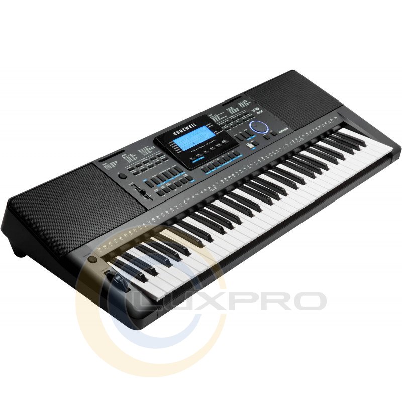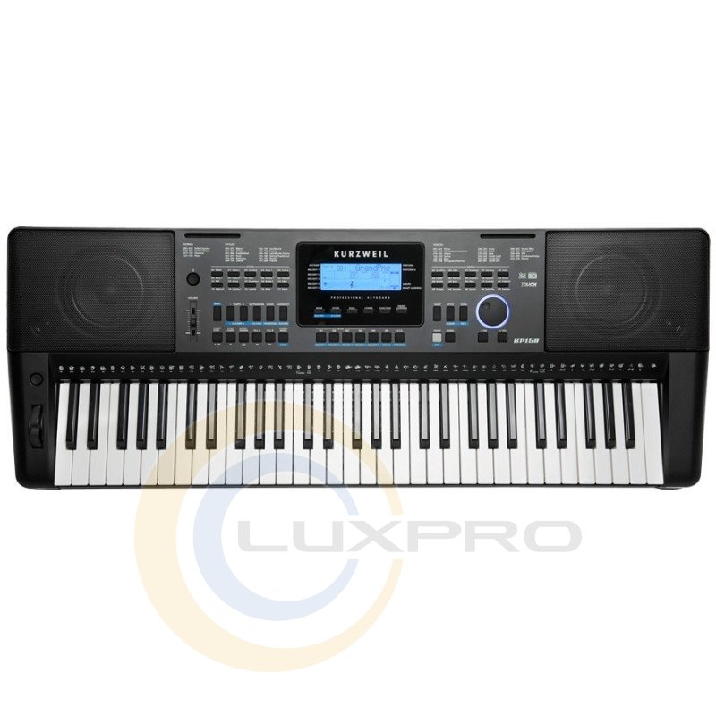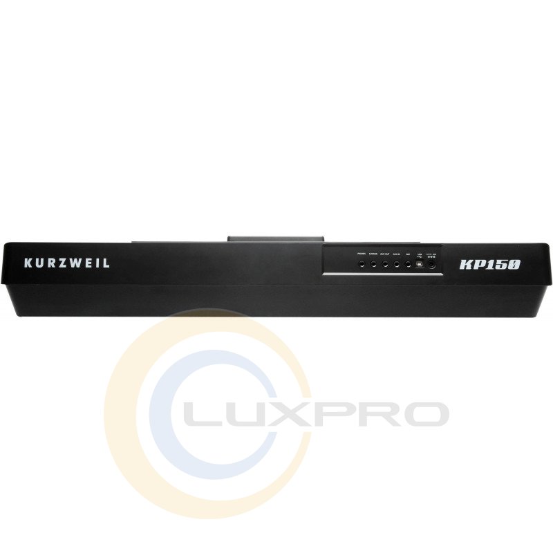 KURZWEIL KP150 - синтезатор, з автоакомпанементом, 61 клавіша сінтізаторного типу з чутливістю до сили натискання (3 рівня), мультифункціональний дисплей, 128-голосова поліфонія, 618 пресетів, 48 призначених для користувача пресетів, функція поділу клавіатури і нашарування тембрів, транспонування, мікроподстройка, ефекти: Reverb / Chorus / EQ , 200 стилів автоакомпанемента, рекордер: 6 треків / 5 пісень, бібліотека: 150 пісень, метроном, акустична система: 15W x 2, 20W x 2, 4 динаміка, вхід для навушників, вхід для педалі Sustain, стерео входи і виходи 1/4 ", мікрофонний вхід, MIDI по USB, пюпітр в комплекті, разме ри: 14.2 x 97 x 37 см, вага: 6.75 Кг, живлення: 12VDC / 3A, або 6 батарейок AA.