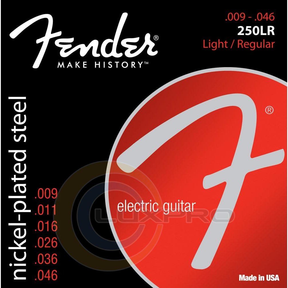 Fender 250LR струни для електрогітар зроблені з нікелю, який вважається найкращим матеріалом для даного продукту. Як результат - максимально чисте звучання. У комплекті йде 6 струн з круглою обмоткою. Калібр струн: .009, .011, .016, .026, .036 і .046 з натягом Light / Regular.