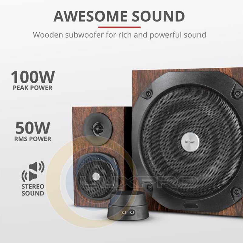 Trust 2.1 Vigor BROWN складається з сабвуфера і двох сателітів. Пікова потужність - 100 Вт (50 Вт RMS). Дерев'яний сабвуфер з драйвером 150 мм. Підключення за допомогою кабелю, високоякісний звук з глибокими низькими частотами.