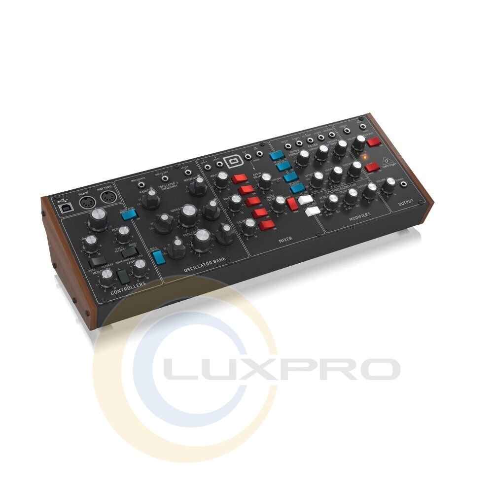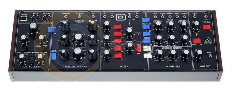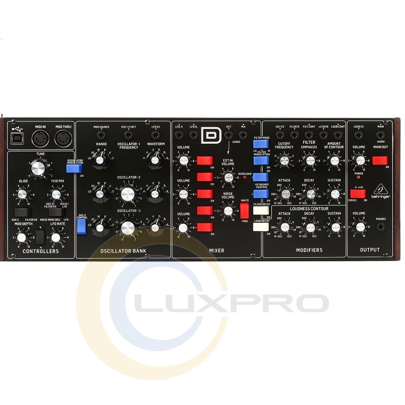 Аналоговий синтезатор Behringer D має вбудовані фільтри низьких / високих частот з керованими огинають для формування необхідного тону. Створіть все що завгодно, включаючи щільні басові лінії, кричущі Ліди, що розкриваються педи / текстури і ефекти. LFO має велику гнучкість завдяки елементам управління глибиною, швидкістю, а також різними параметрами маршрутизації. MIDI In / Thru дозволяє інтегрувати вашу MIDI-клавіатуру, в той час як гнізда CV забезпечують полумодульную гнучкість.